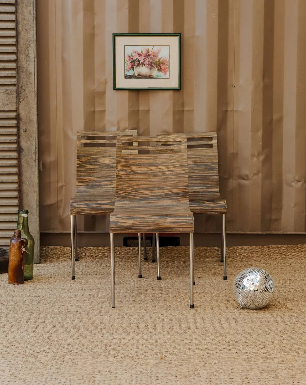 Adoptez ce lot de trois chaises en bois zébré au charme vintage, où le veinage graphique du bois apporte une signature visuelle chaleureuse et raffinée à votre salle à manger, cuisine ou coin bureau. Leur assise assure un confort quotidien et s’intègre aisément à une table familiale comme à un petit espace bistrot, tandis que la patine naturelle confère une allure accueillante. Quelques traces d’usage sont présentes.