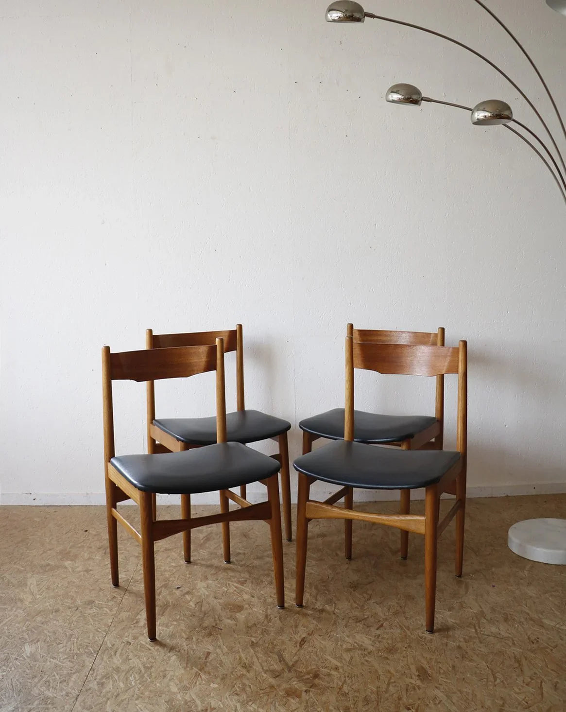 Invitez l’esprit du design italien dans votre salle à manger avec cette suite de quatre chaises Gessep des années 60 en teck, habillées d’assises en skaï noir. Leur silhouette élancée et leurs proportions contenues offrent un confort sobre et adapté aux coins repas contemporains, tandis que l’association du teck chaud et du skaï crée un contraste graphique et chaleureux. Ces chaises apportent une touche rétro raffinée, idéale pour composer une table conviviale et intemporelle.