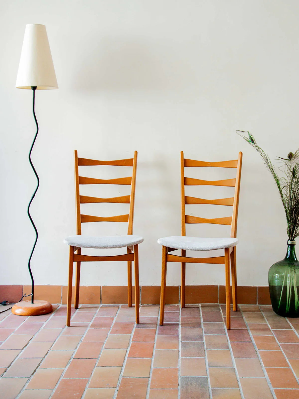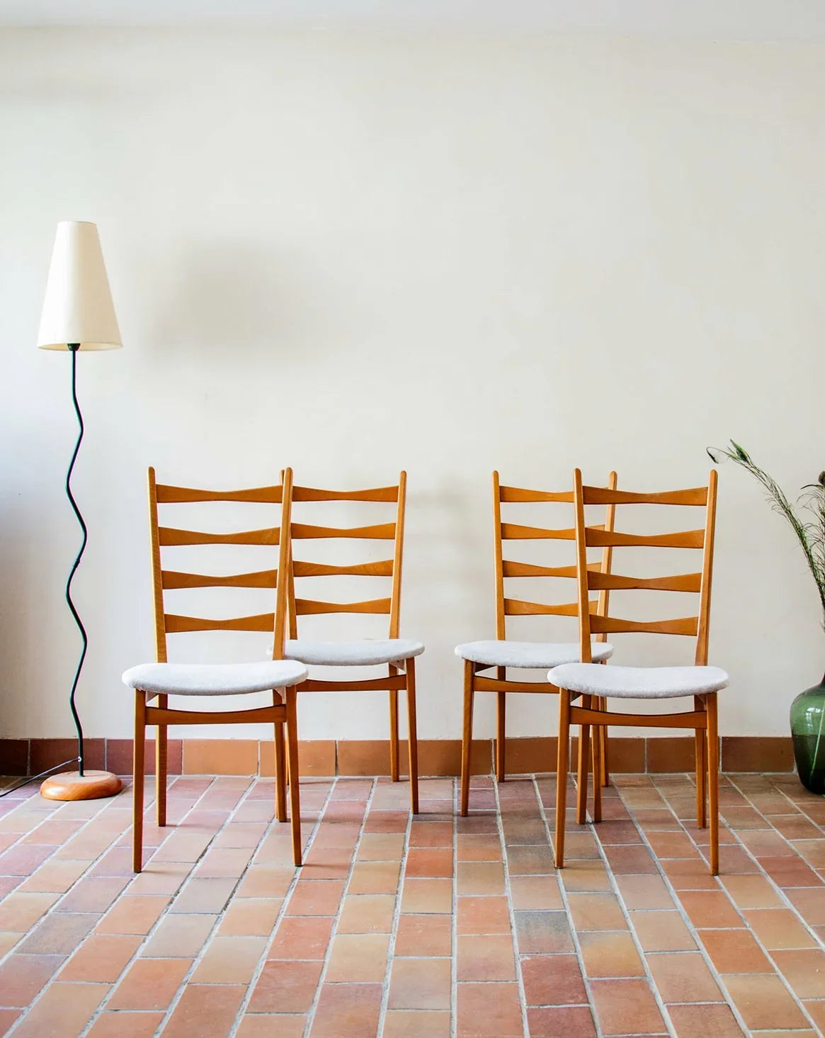 Découvrez ce lot de 4 chaises au design sobre et intemporel, parfait pour compléter votre salle à manger ou un espace bureau. Chaque chaise présente une structure en bois robuste associée à une assise en tissu gris. Leur silhouette simple met en valeur les matériaux. On les imagine autour d’une table en bois brut ou dans un coin repas lumineux. Quelques traces d’usage mais en excellent état!