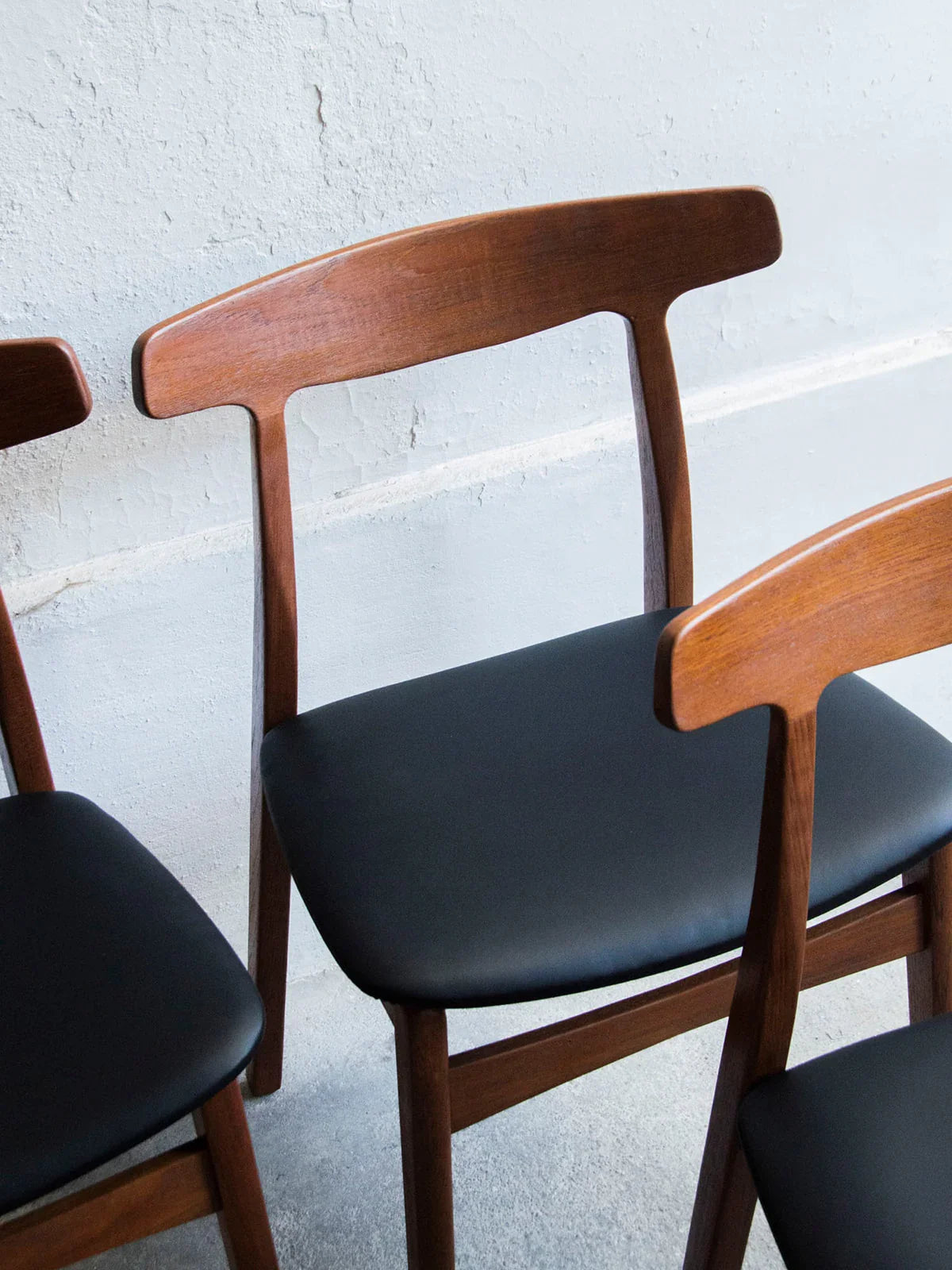 Ajoutez une touche d’élégance vintage à votre intérieur avec ce lot de 4 chaises dans l’esprit de Henning Kjaernulf pour Bruno Hansen en 1960. Fabriquées en teck et palissandre, ces chaises se distinguent par leur dossier discret et leurs pieds droits, alliant confort et esthétique. Le revêtement en simili cuir garantit un entretien facile tout en apportant une note contemporaine à ce design intemporel. Un choix parfait pour compléter votre salle à manger ou votre espace de travail ! Vendu par lot de 4 chaises, 2 lots disponibles.