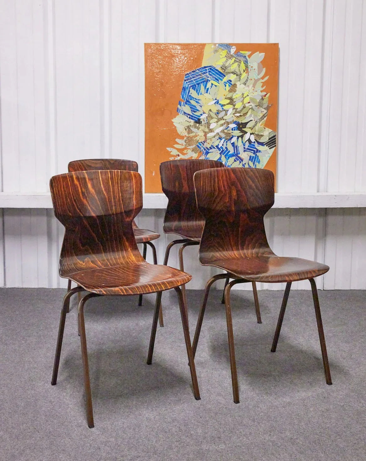 Adoptez ce lot de quatre chaises en bois Obo Eromes Wijchen, où le veinage graphique du bois dialogue avec des piètements chromés. Leurs proportions équilibrées offre une assise confortable et une présence élégante autour d’une table à manger ou dans un coin repas lumineux. L’esthétique mêle esprit vintage et accents contemporains, idéale pour créer une ambiance chaleureuse et soignée. Un petit trou est présent sur l’une des chaises. 2 lots disponibles à l’achat.