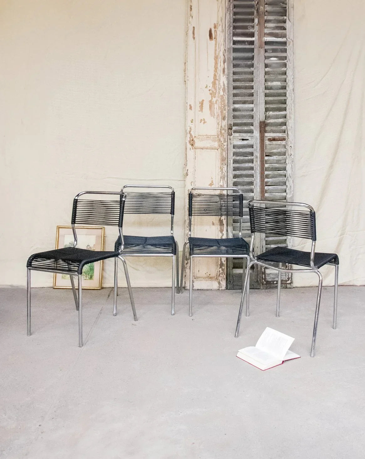 Invitez ces quatre chaises au design rétro en métal chromé, assise et dossier en scoubidou noir tressés et croisés pour un effet graphique et chaleureux. Le dossier recourbé élance la silhouette et assure un maintien agréable, parfait autour d’une table, dans un coin repas ou pour ponctuer un bureau contemporain. Le contraste du chrome et de la matière synthétique crée une ambiance vintage, conviviale et raffinée. Légères traces du temps présentes.
