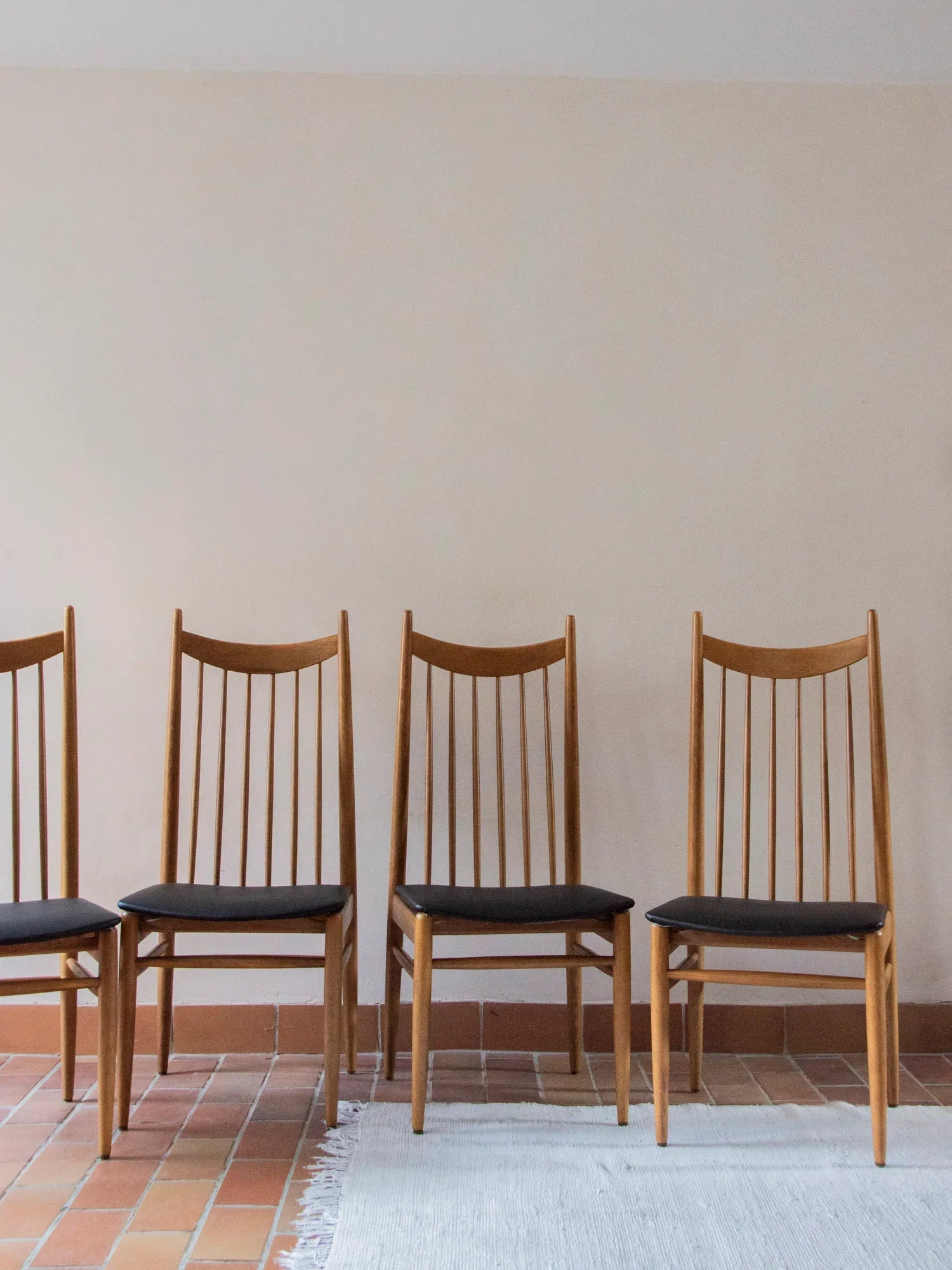 Découvrez cette superbe série de 4 chaises de style scandinave des années 50/60, parfaites pour apporter une touche d’élégance à votre intérieur. Leur structure en chêne, associée à des assises retapissées à neuf en skaï noir, assure robustesse et confort. Ces chaises, inspirées des créations danoises de Bramin et du modèle 422 d’Arne Vodder, sont en très bon état général, stables et entièrement huilées pour un entretien facile. Un choix idéal pour les amateurs de design vintage et intemporel !
