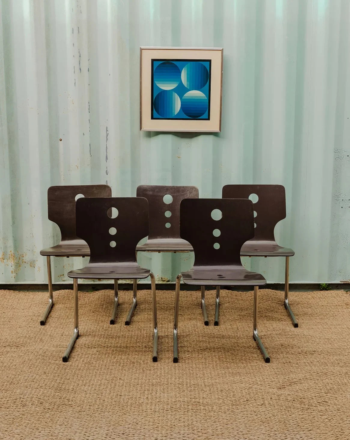 Adoptez ce lot de cinq chaises marron aux pieds chromés, dont le design rétro et les découpes dans le dossier apportent une allure graphique et chaleureuse. Leur assise et proportions conviendront à une salle à manger, une cuisine conviviale ou un coin café, offrant une mise en scène vintage contemporaine. Le mélange bois et métal crée une atmosphère raffinée et facile à associer à différents décors. Quelques traces d’usure présentes.