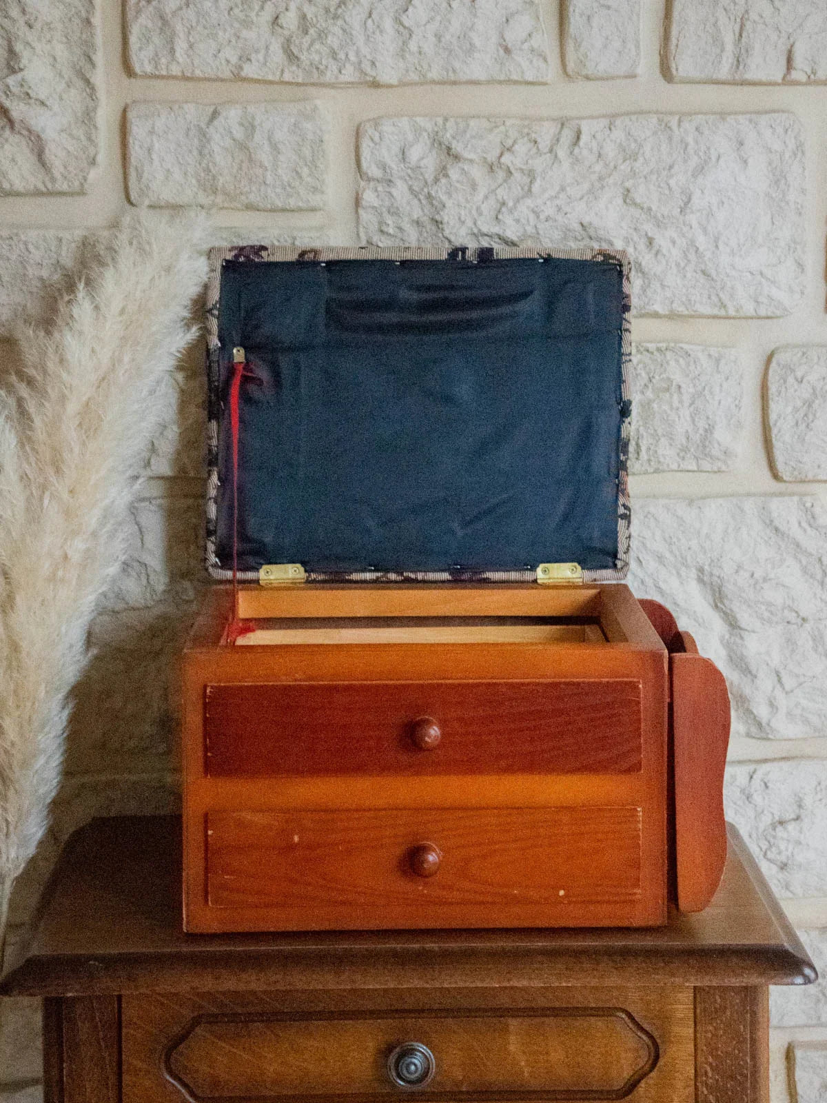 Découvrez cette boîte à couture en bois dont le dessus est recouvert d’un tissu floral, alliant utilité et élégance. Le couvercle à clapet s’ouvre sur un espace de rangement principal, complété par deux tiroirs et un compartiment latéral pour organiser fils, aiguilles et petits accessoires. Sa patine chaleureuse et le motif fleuri apportent une touche rétro et délicate, parfaite pour un coin couture ou posée sur une coiffeuse, où elle structure l’espace tout en restant décorative.