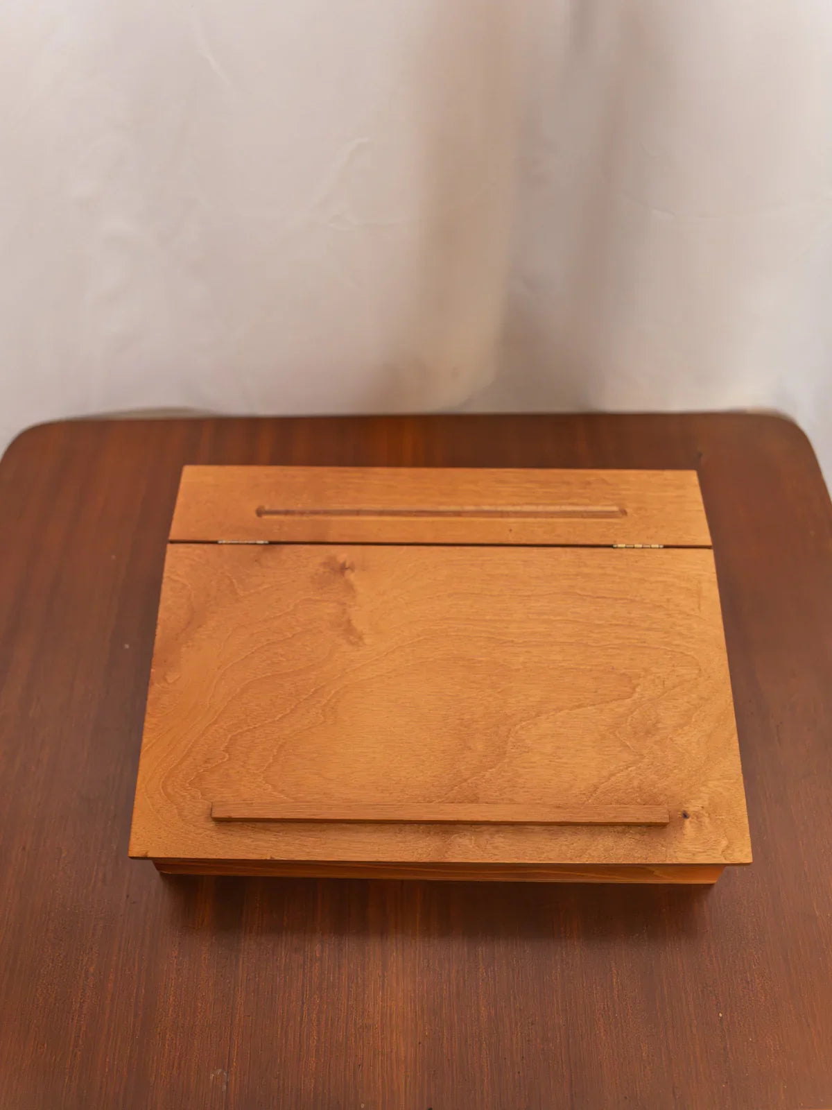 Adoptez cet écritoire artisanal en bois clair, petit format, au charme sobre et travaillé. Sa surface intime et son repose-stylo intégré en font un compagnon idéal pour la correspondance, les croquis et les notes quotidiennes, sans encombrer un bureau ou une console. La patine douce et la finition manuelle apportent une atmosphère chaleureuse et propice à la création, entre tradition et simplicité. Légères traces du temps présentes.