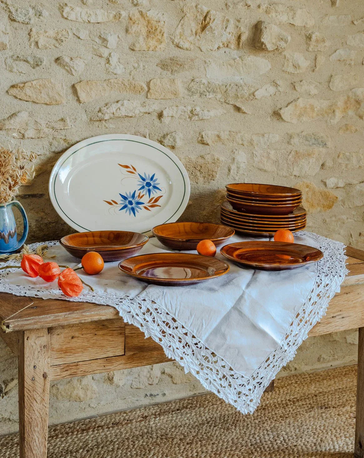 Invitez cet ensemble iconique marron en faïence vernissée de Saint-Clément, composé de huit assiettes plates et six assiettes creuses, à habiller votre table d’une élégance discrète et chaleureuse. La glaçure met en valeur la teinte profonde et les formes classiques du service, offrant une présentation soignée pour entrées, plats et potages ; son format généreux le rend idéal pour repas quotidiens ou dîners conviviaux. Quelques éclats présents qui n’enlèvent rien au charme et à l’utilité.
