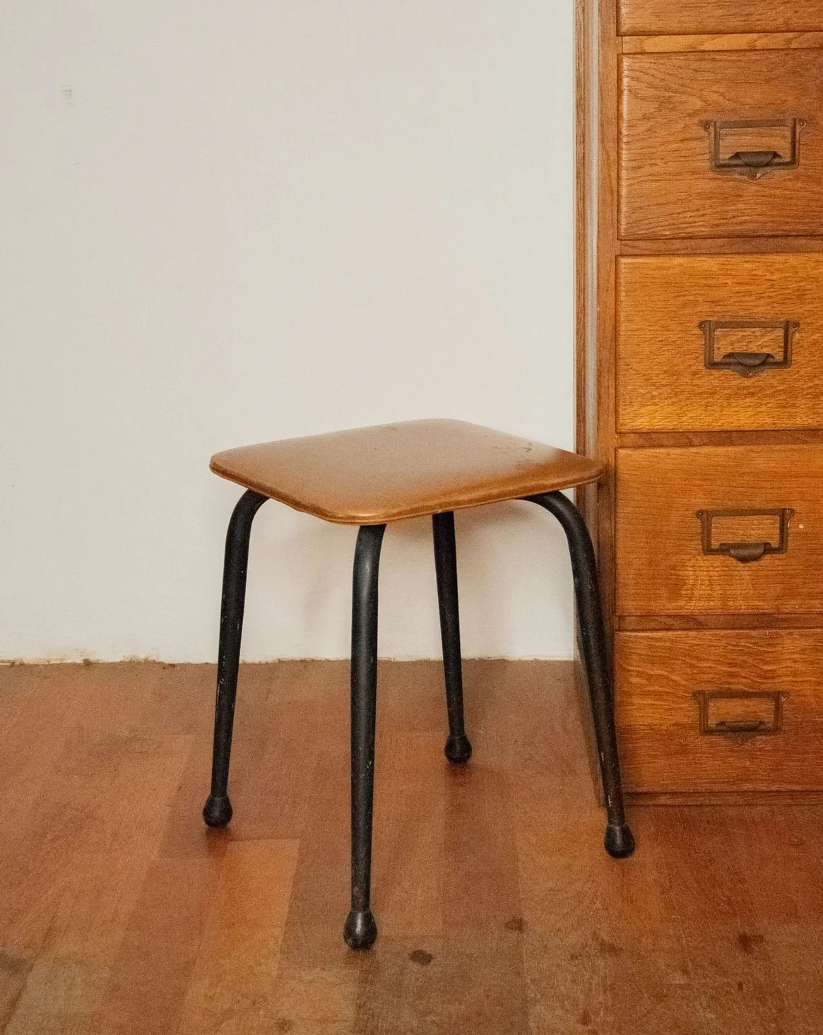 Adoptez ce petit tabouret des années 50, au charme discret et à la silhouette compacte. Ses pieds en métal noir lui apportent une élégance graphique tandis que l’assise en similicuir marron propose une assise chaleureuse, résistante et facile d’entretien. Idéal comme siège d’appoint, repose-pieds ou chevet dans un intérieur aux lignes sobres, il s’intègre parfaitement aux petits espaces, facile à déplacer; ses patins protègent les sols et assurent une stabilité fiable.
