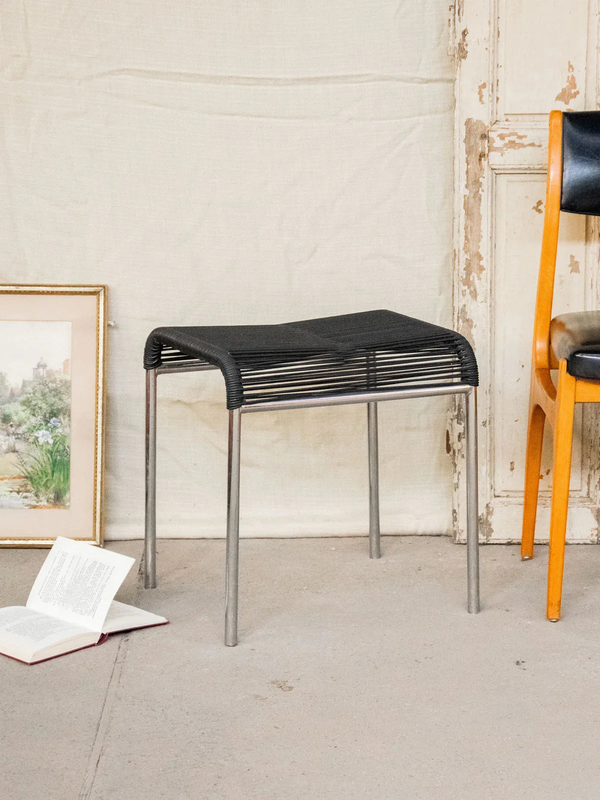 Apportez une touche vintage et graphique avec ce tabouret au piètement chromé et à l’assise en scoubidou tressé noir. Compact et stable, il s’invite autour d’une table de bar, dans un coin lecture ou comme assise d’appoint, ses proportions offrant confort et praticité. Le contraste du chrome poli et du tressage crée une ambiance contemporaine et chaleureuse, facile à intégrer dans une décoration sobre ou bohème. Légères traces du temps et quelques piqûres discrètes.