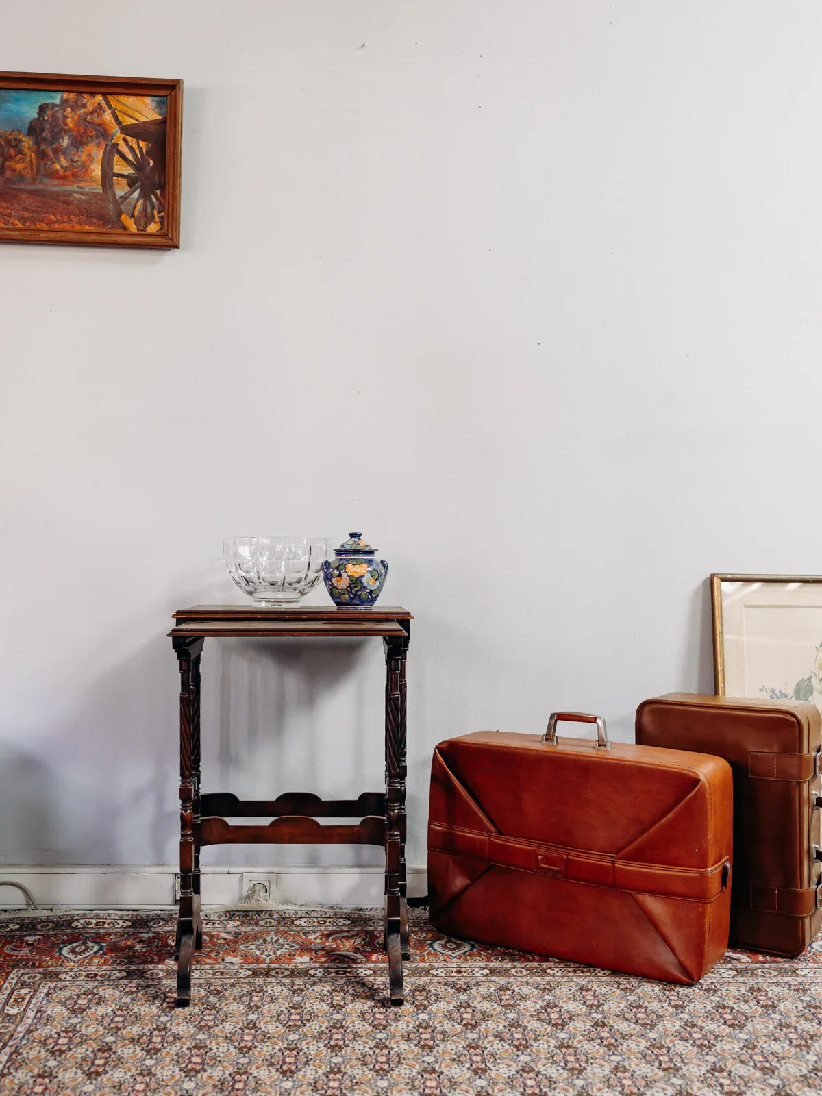 Adoptez ces tables gigognes en bois travaillé, une paire harmonieuse où la petite se coulisse sous la grande pour libérer l’espace et varier les usages, table d’appoint ou desserte élégante. Les plateaux présentent des dessins gravés qui apportent une touche artisanale et raffinée, tandis que le bois patiné ajoute chaleur et caractère à un intérieur contemporain ou classique. Placage manquant sur le plateau.