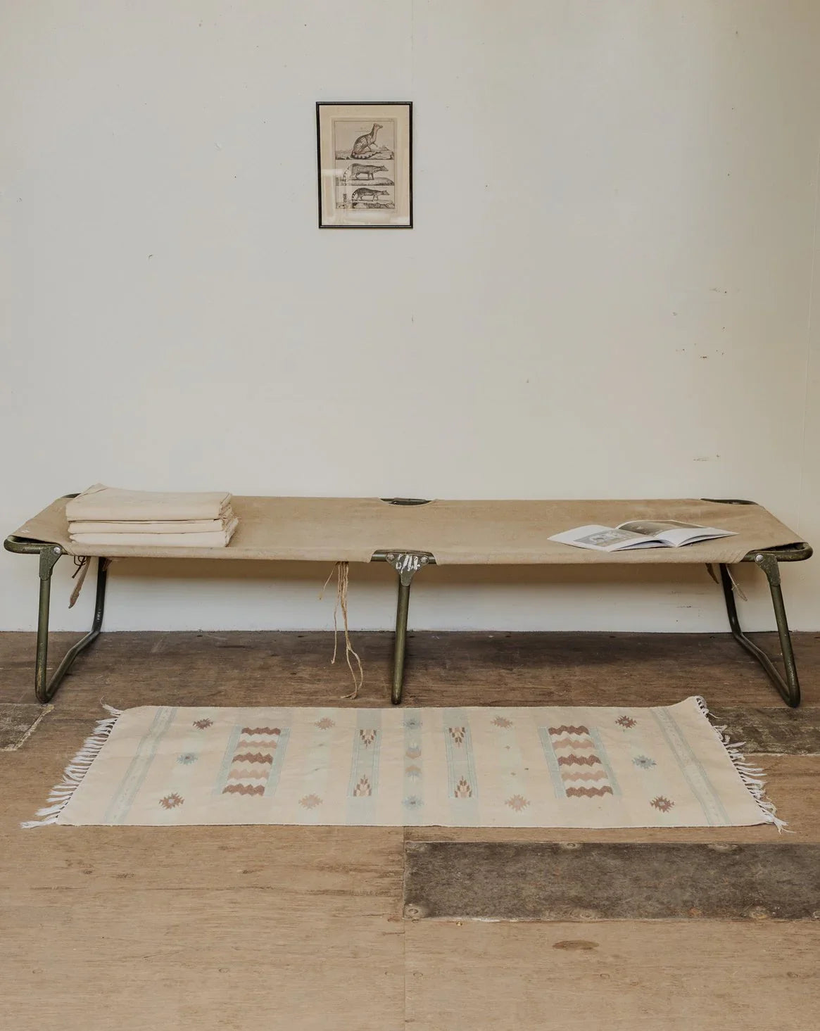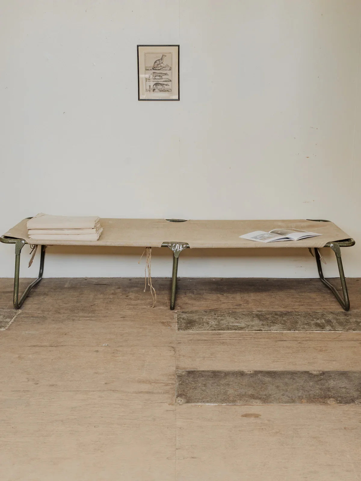 Adoptez ce lit de camp vintage en chanvre couleur naturelle aux pieds en métal kaki, une pièce au charme sobre et nomade qui s’intègre aussi bien en chambre d’appoint qu’en terrasse abritée. Sa toile robuste et ses proportions offrent un couchage confortable pour une personne, tandis que sa structure métallique le rend stable et facile à plier pour le ranger ou l’emporter. Son esthétique chaleureuse crée une ambiance détendue et authentique. Quelques traces d’usage et quelques tâches sur le tissu.