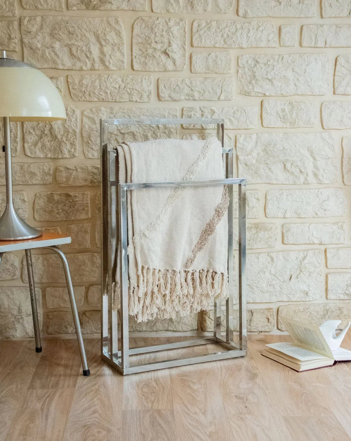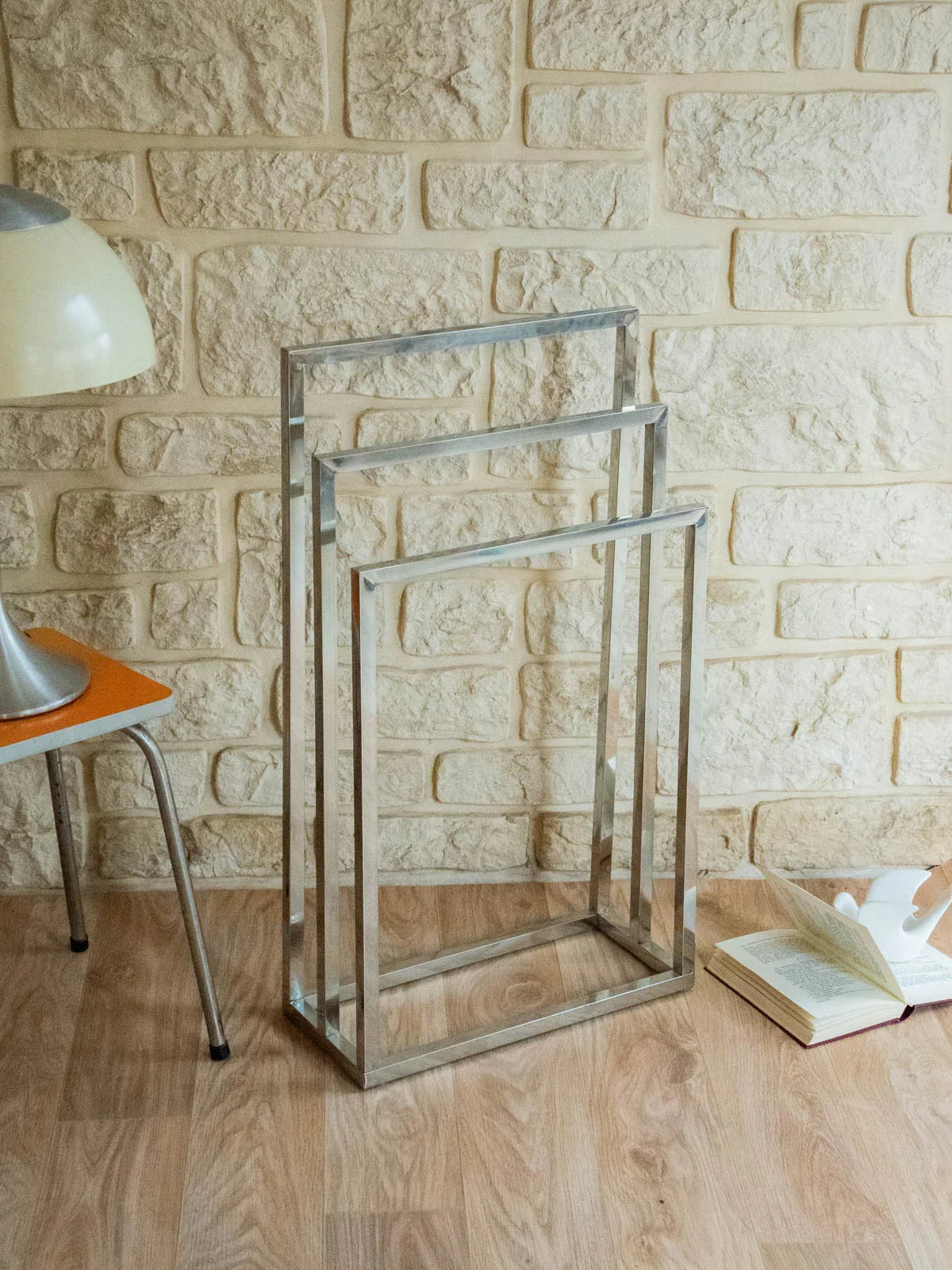 Adoptez ce porte‑serviettes chromé à trois pendants au design épuré et contemporain. Idéal pour optimiser l’espace d’une petite salle de bains. La finition chromée apporte une sobriété élégante, facile d’entretien et parfaitement assortie à une salle d’eau moderne. En bon état, il reste fonctionnel et discret dans un intérieur soigné.