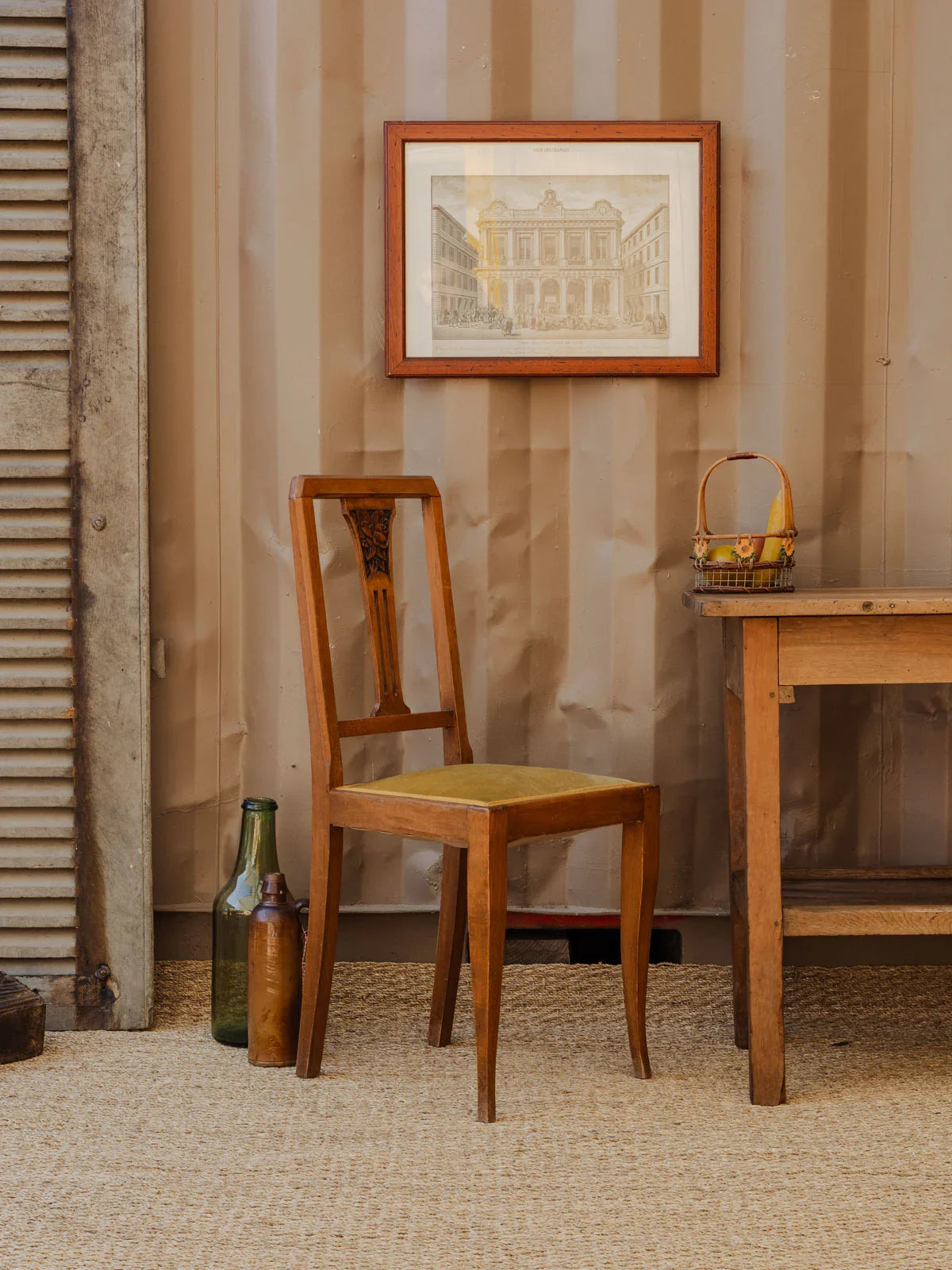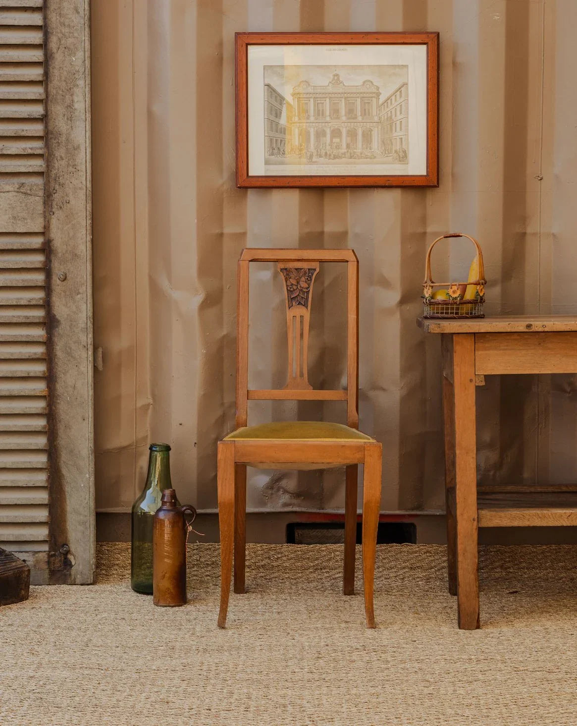 Adoptez cette chaise Art déco au charme intemporel, associant un velours vert profond sur l’assise à un dossier orné d’un dessin fleuri délicat. Sa silhouette élancée et ses proportions offrent un confort raffiné pour une salle à manger, un coin lecture ou une entrée élégante. La texture du velours capte la lumière et installe une atmosphère chaleureuse et sophistiquée, tandis que le motif floral apporte une touche décorative rétro qui dialogue avec des intérieurs contemporains.