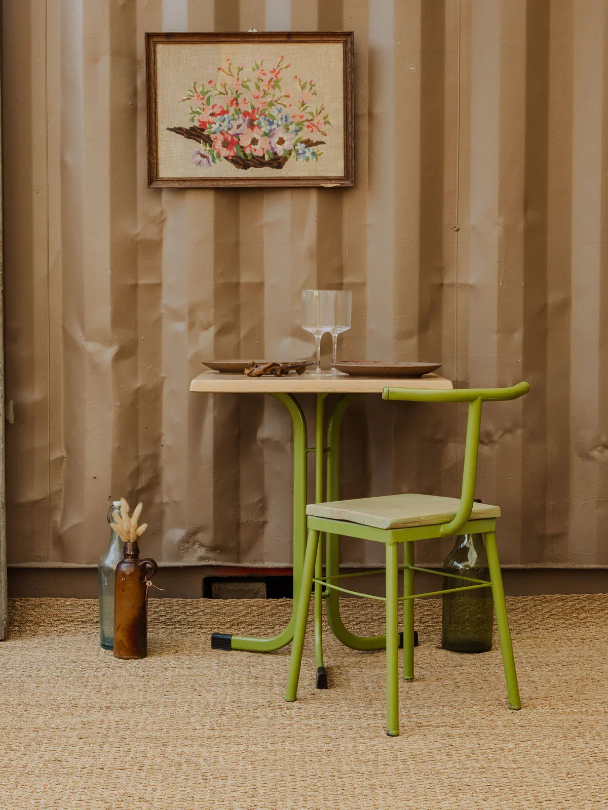 Adoptez cette table à manger style bistrot restaurée, au plateau patiné beige et aux pieds peints d’un vert doux qui lui donnent une personnalité subtile. Son format carré en fait une alliée parfaite pour un coin repas intime, une cuisine citadine ou une terrasse, sans encombrer l’espace. La finition travaillée mêle charme d’atelier et touche contemporaine, créant une ambiance chaleureuse et conviviale pour des moments partagés.