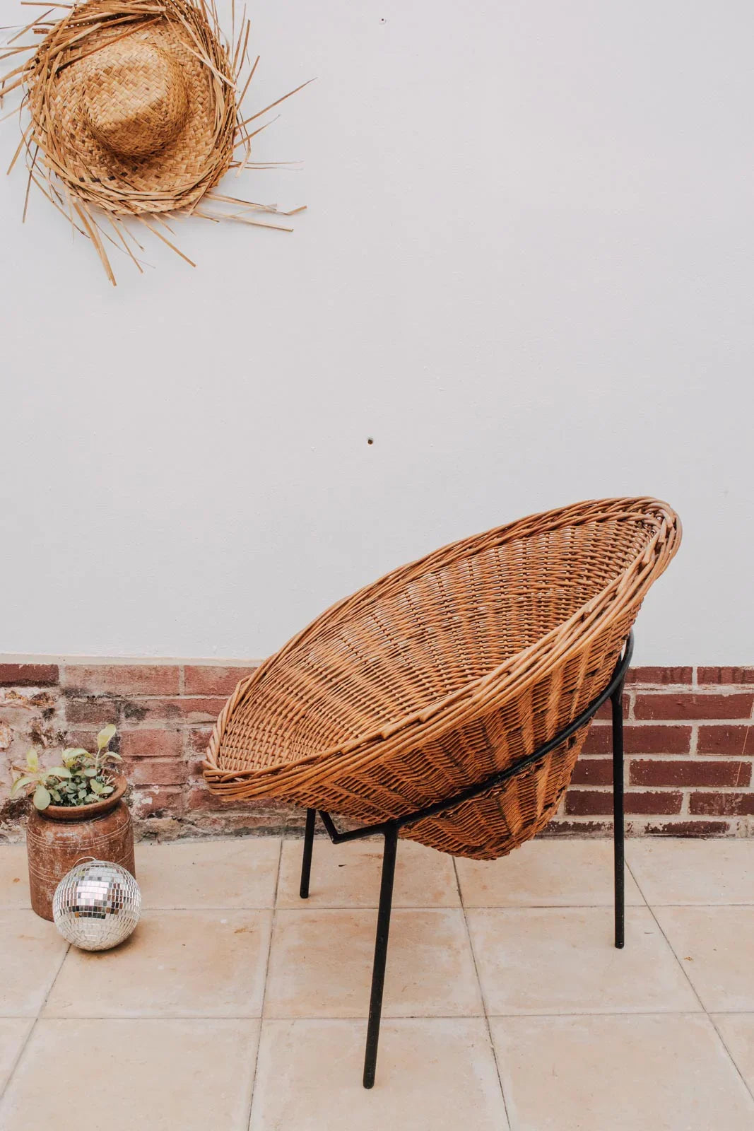 Découvrez ce fauteuil en rotin signé Robert Mango, emblématique du design italien des années 50. Sa structure en métal noir souligne avec élégance les courbes du rotin naturel. Une assise légère et sculpturale, parfaite pour un intérieur vintage ou contemporain. Quelques traces de patine sur le piètement témoignent de son authenticité. Une pièce rare au charme intemporel.