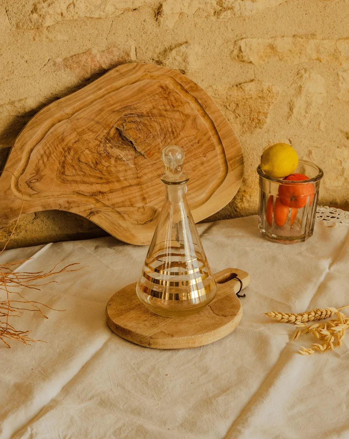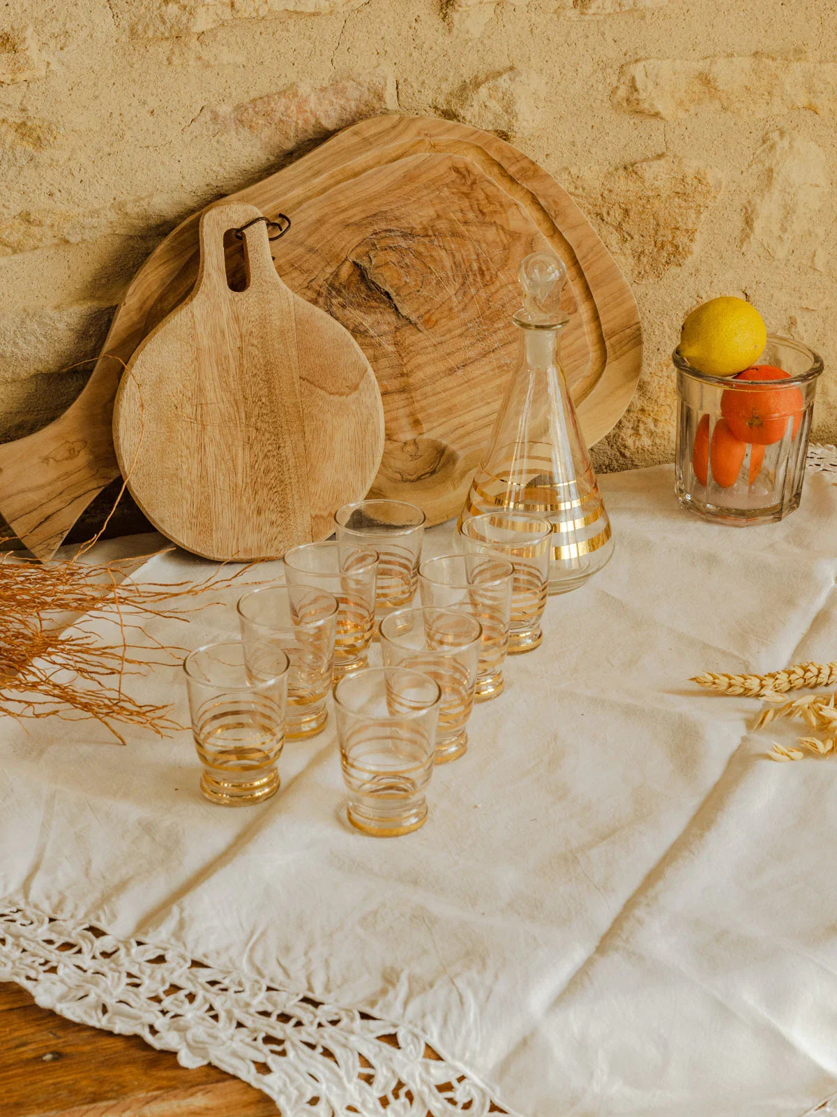 Ajoutez ce service à liqueur composé d’une carafe et de huit verres en verre fin, ornés de dorures, qui apporte une élégance rétro à vos moments de dégustation. La carafe, au profil élancé, dialogue avec les petits verres délicats, idéaux pour les digestifs ou un apéritif raffiné entre amis. Les dorures subtiles captent la lumière et instaurent une atmosphère chaleureuse et sophistiquée, parfaite pour une table dressée avec soin.