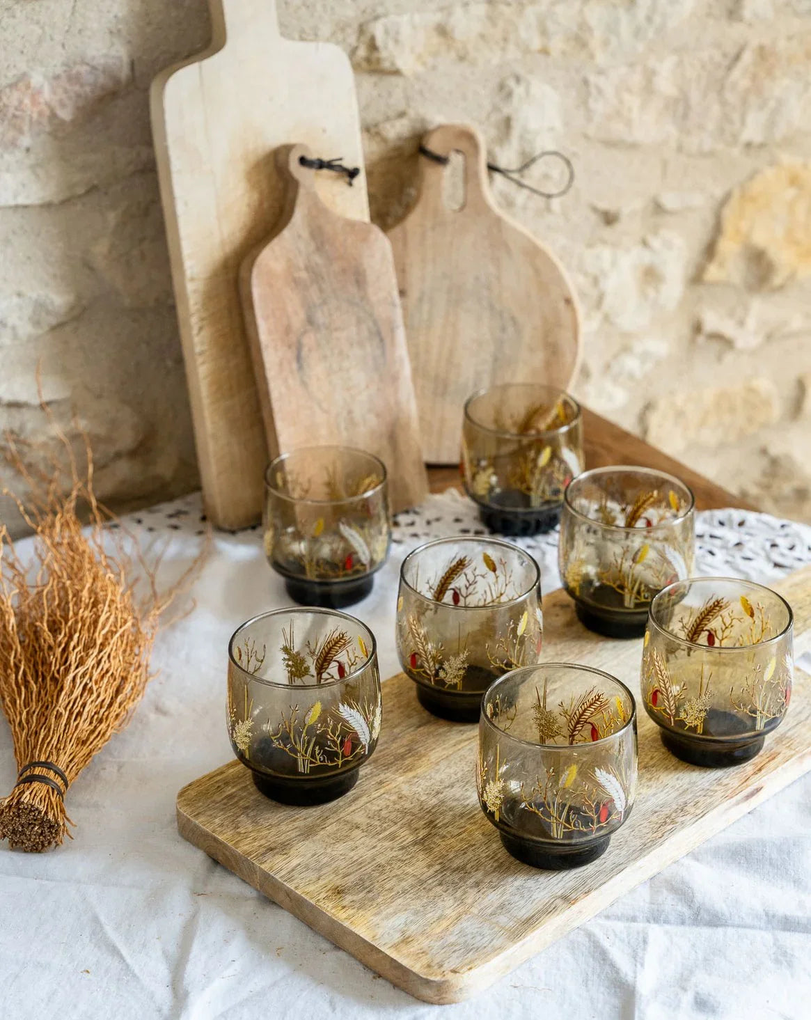 Ajoutez une touche rétro à votre table avec ce lot de 7 verres vintages en verre fumé, délicatement ornés d’un élégant motif de blé. Parfaits pour vos soirées entre amis ou vos dîners en famille, ces verres allient esthétique et praticité. Leur finition transparente et leur design raffiné sublimeront tous vos cocktails ou boissons préférées, tout en apportant chaleur et charme à votre intérieur. Offrez-vous un moment de convivialité avec ces pièces uniques au style intemporel.