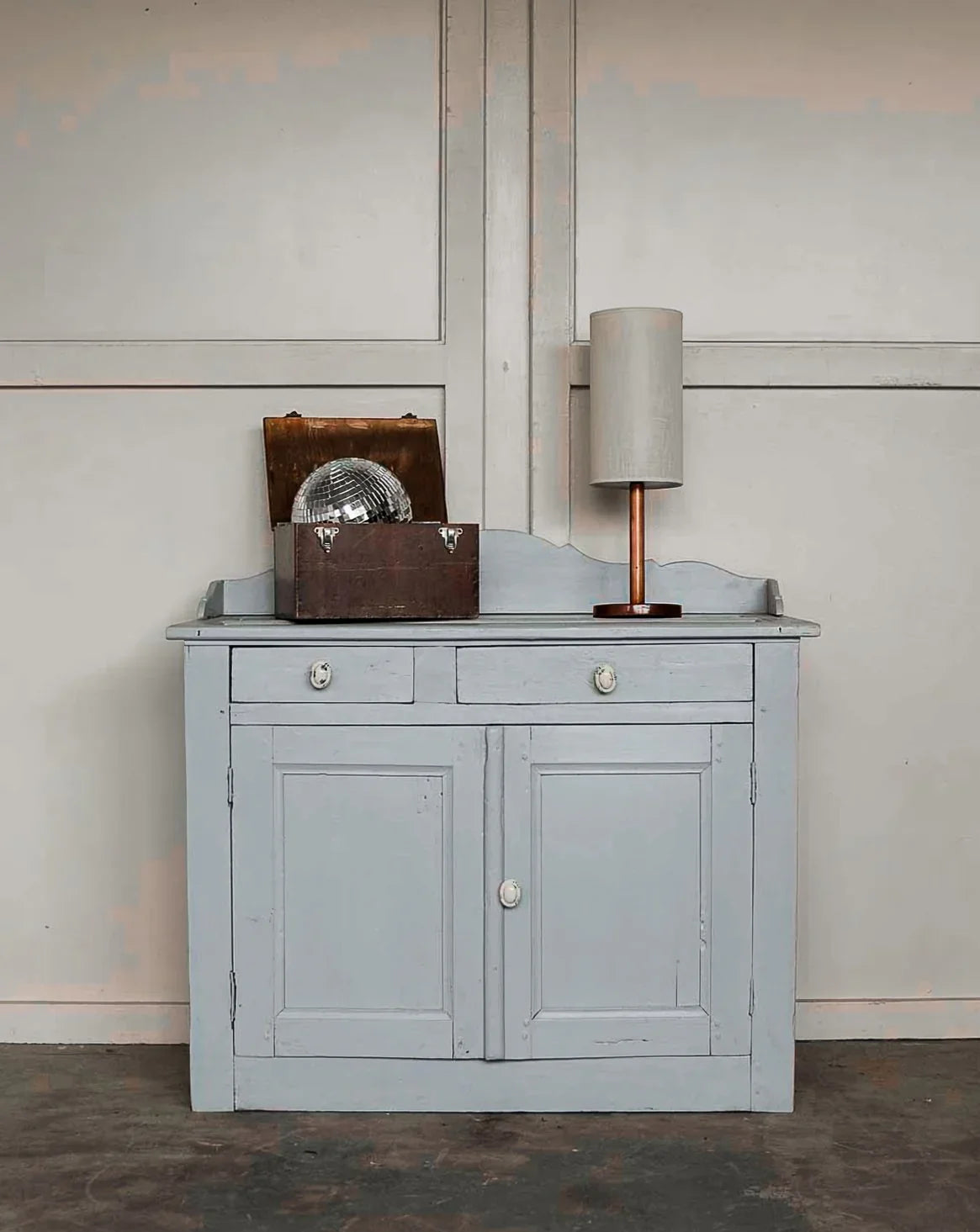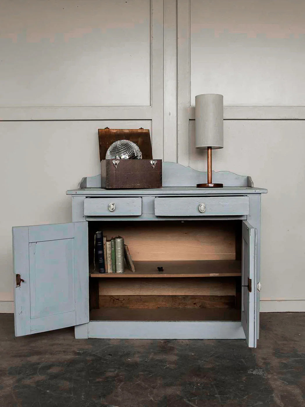 Découvrez ce buffet ancien entièrement restauré, à la fois commode et meuble de rangement, habillé d’une patine bleu-gris douce qui apporte une note intemporelle. Il propose deux tiroirs et deux portes, une étagère intérieure en aggloméré et des poignées en porcelaine, offrant une belle capacité pour la vaisselle quotidienne ou le linge de maison. Solide et sain, il présente des proportions équilibrées qui s’adaptent aussi bien à une cuisine qu’à une salle à manger ou une entrée. Sa corniche est amovible. Sobriété et charme ancien se marient ici pour créer une pièce pratique et inspirante. Légères traces du temps qui participent à son charme.