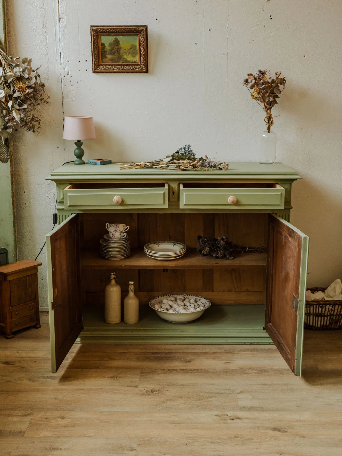 Découvrez ce buffet en bois patiné vert d’eau aux lignes délicates et aux moulures florales qui racontent une histoire. Ses deux tiroirs et son étagère intérieure offrent un rangement organisé pour la vaisselle et le linge de table, tandis que les poignées laissées en bois clair soulignent son charme naturel. La serrure et la clé fonctionnelle apportent une note d’authenticité et de sécurité. Idéal pour instaurer une ambiance douce et raffinée dans une salle à manger ou une entrée.