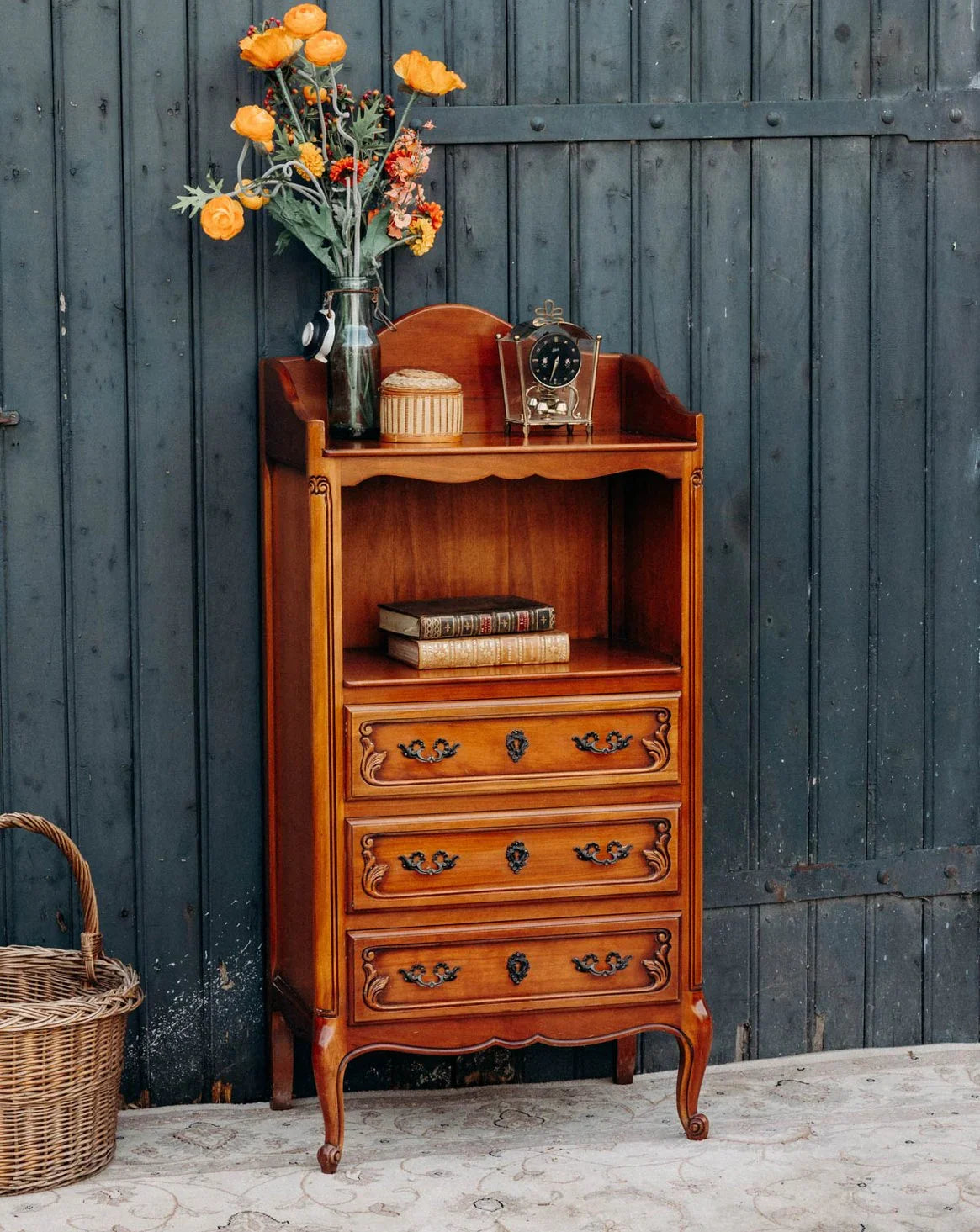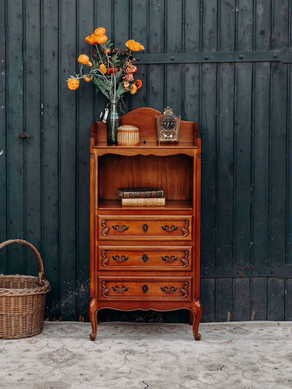 Découvrez ce meuble d’appoint en bois haut, alliant élégance et fonctionnalité. Équipé de trois tiroirs spacieux et d’une niche, il offre un rangement pratique tout en mettant en valeur ses gravures délicates dans le bois. Les détails en métal au niveau des tiroirs ajoutent une touche moderne, tandis que ses pieds courbés apportent une note de sophistication. Un choix parfait pour sublimer votre intérieur avec style !