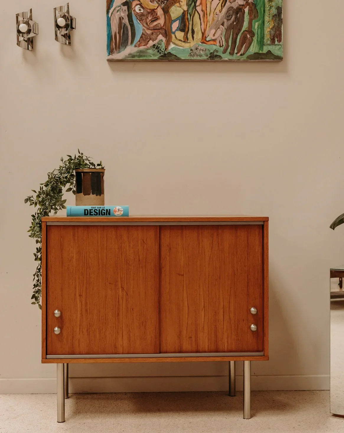 Adoptez ce buffet en teck aux lignes épurées, sublimé par des poignées rondes en métal et des pieds chromés qui lui confèrent une silhouette aérienne. Ses deux placards coulissants offrent un rangement modulable, idéal pour la vaisselle, les archives ou l’équipement multimédia discret, tandis que le bois foncé apporte une chaleur subtile. Parfait pour ancrer une salle à manger ou nuancer un salon contemporain, il crée une atmosphère élégante et apaisée.