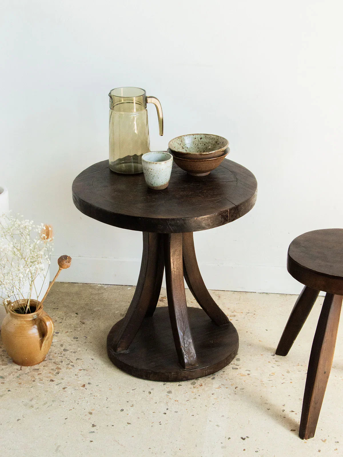 Découvrez ce charmant guéridon circulaire en teck vintage, au style indonésien authentique. Ses pieds incurvés élégants se rejoignent sur un socle rond, apportant équilibre et caractère. Mobilier de seconde main provenant d’Asie, il raconte une belle histoire. Les traces du temps lui confèrent une patine pleine de charme sans nuire à sa solidité. Une pièce stable et unique pour enrichir votre intérieur avec goût.