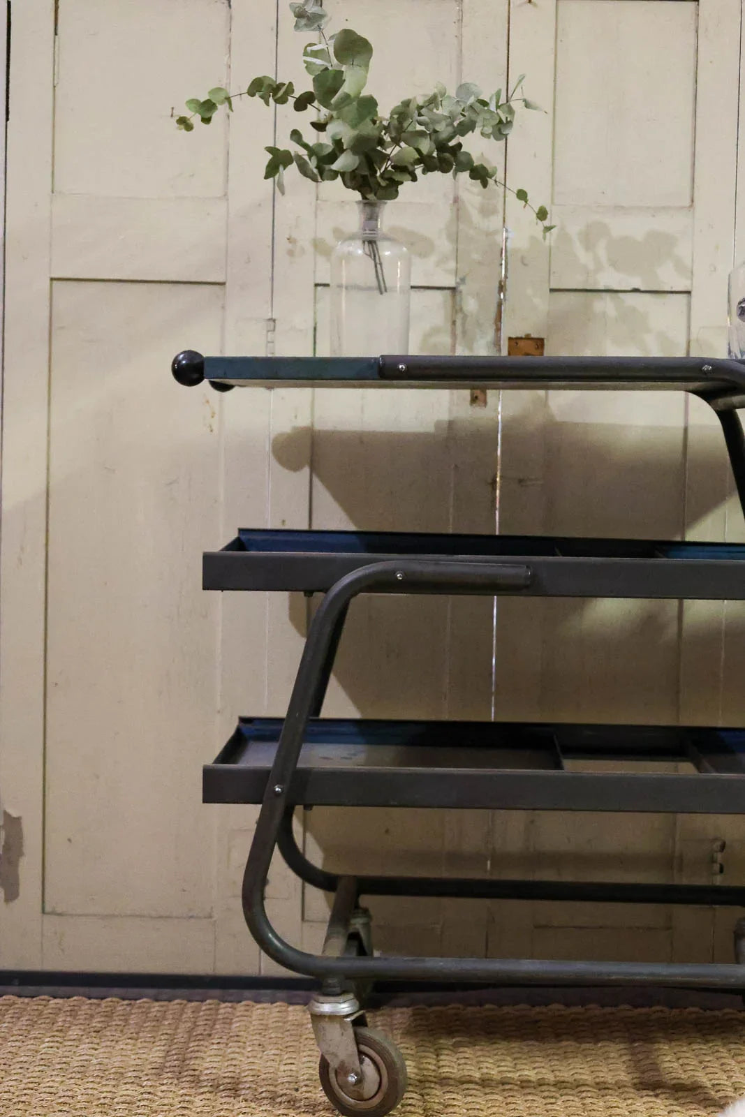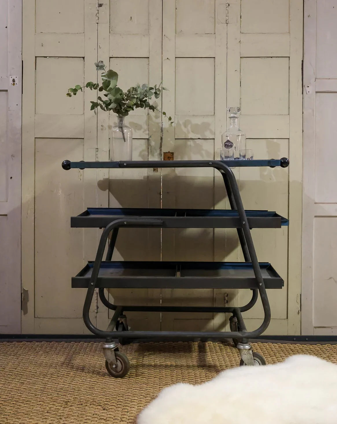 Invitez cette desserte d’atelier sur roulettes métallique, où la structure dialogue avec des plateaux bleus patinés au charme discret. Ses trois plateaux amovibles, qui s’ouvrent de part et d’autre, offrent un rangement modulable et une accessibilité parfaite pour cuisine, atelier ou salon. Mobile et stable, elle se glisse facilement pour servir de comptoir d’appoint ou desserte de service. Sa patine raconte l’usage et apporte une touche industrielle chaleureuse.