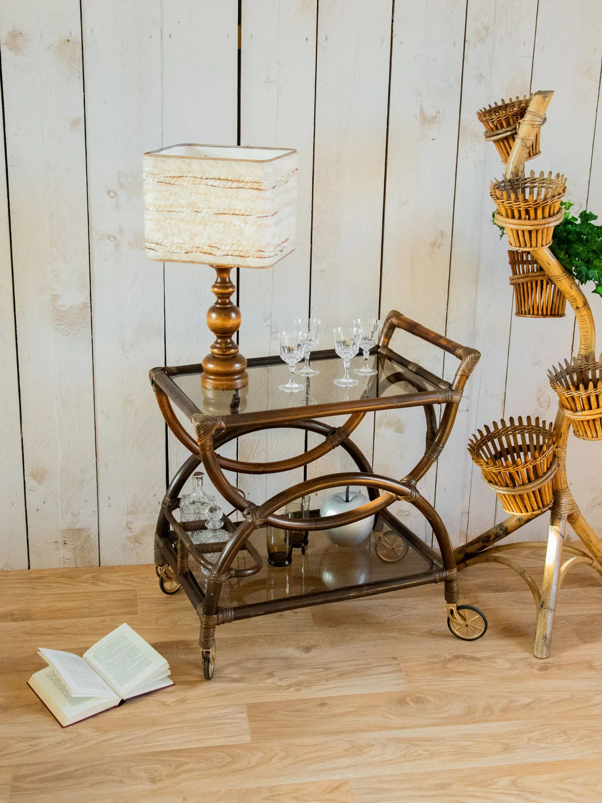 Sublimez vos moments conviviaux avec cette desserte en rotin et bambou au charme naturel, dotée d’un plateau en verre fumé et d’une poignée pratique. Compacte et mobile grâce à ses roulettes dorées, elle se déplace aisément du salon à la terrasse pour accompagner apéritifs et réceptions, et son organisation discrète accueille jusqu’à trois bouteilles tout en laissant de la place pour verres et accessoires. Le mariage du rotin, du bambou et du verre crée une ambiance chaleureuse et élégante, idéale pour un coin bar intimiste.