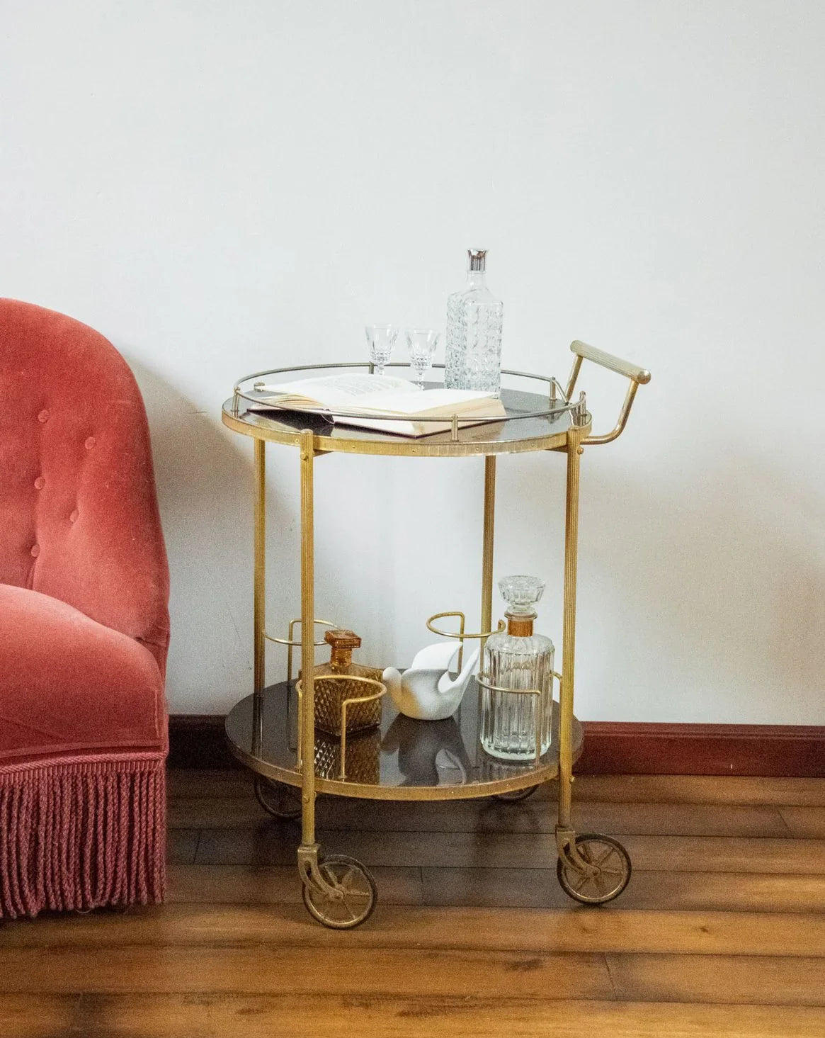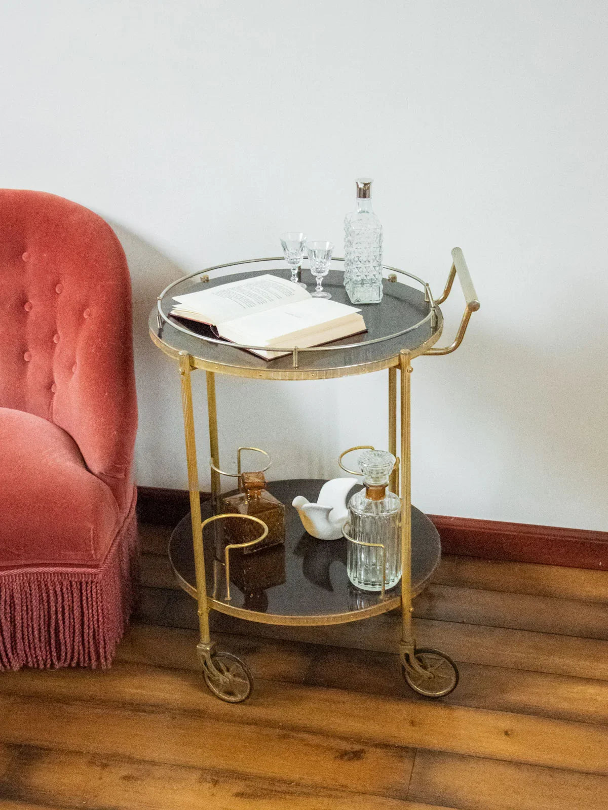 Invitez cette desserte aux allures de bar sur roulettes, dont les deux plateaux ronds en formica apportent une touche rétro et élégante. Le plateau supérieur, surplombé d’un support métallique doré, met en scène carafes et accessoires, tandis que le plateau inférieur intègre quatre supports conçus pour ranger les bouteilles et garder l’essentiel à portée de main. Mobile et polyvalente, elle installe une atmosphère conviviale pour l’apéritif ou le service en salon.