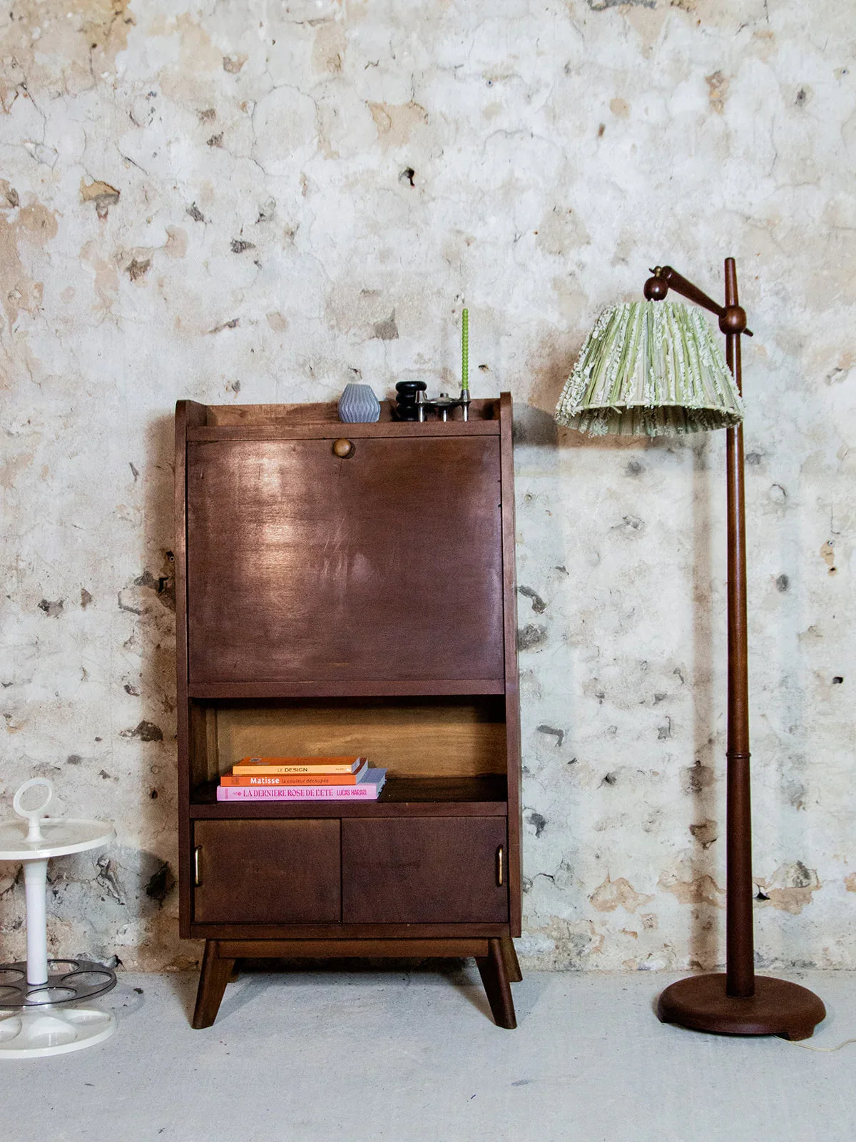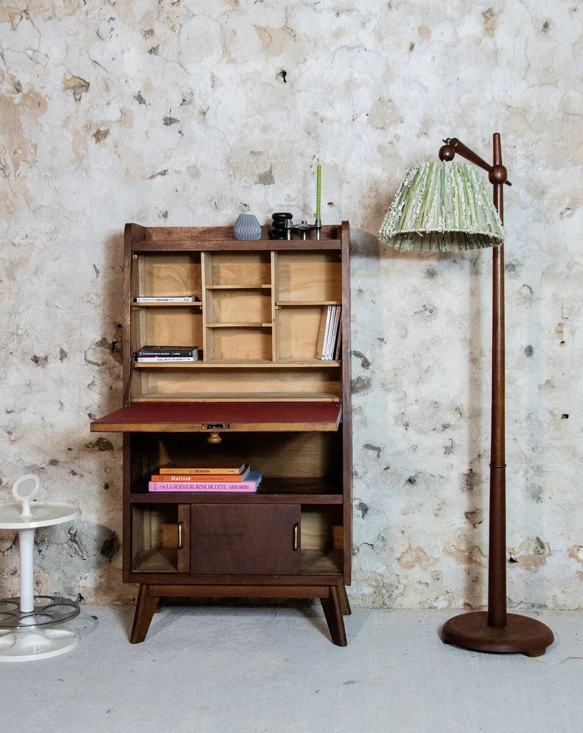 Découvrez ce secrétaire au design rétro des années 50/60, avec ses lignes inclinées, son piètement compas et sa finition noyer chaleureuse. Compact mais astucieusement agencé, il offre un abattant ouvrant sur une niche compartimentée idéale pour organiser votre petit matériel. En bas, deux portes coulissantes aux poignées joliment dessinées complètent l’ensemble. Stable et en bon état général, il présente quelques taches d’encre à l’intérieur. Un meuble fonctionnel et élégant, parfait pour un coin bureau discret.