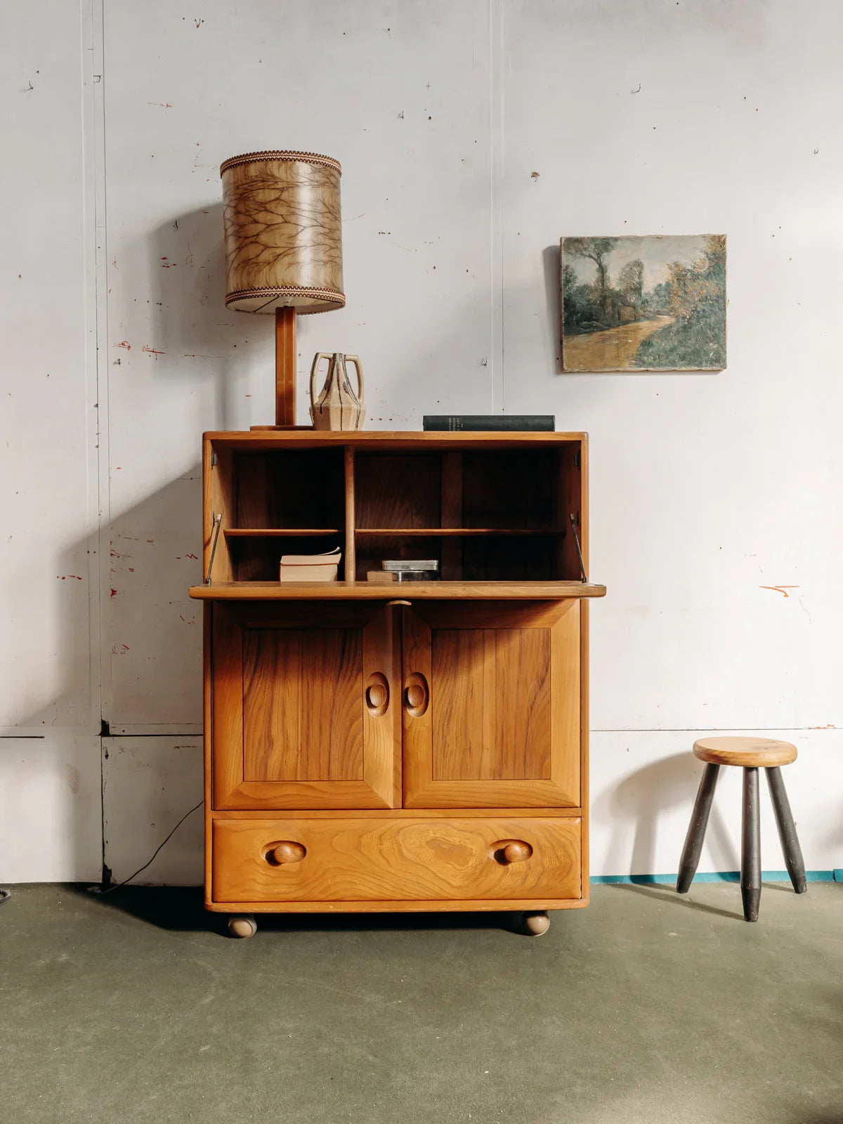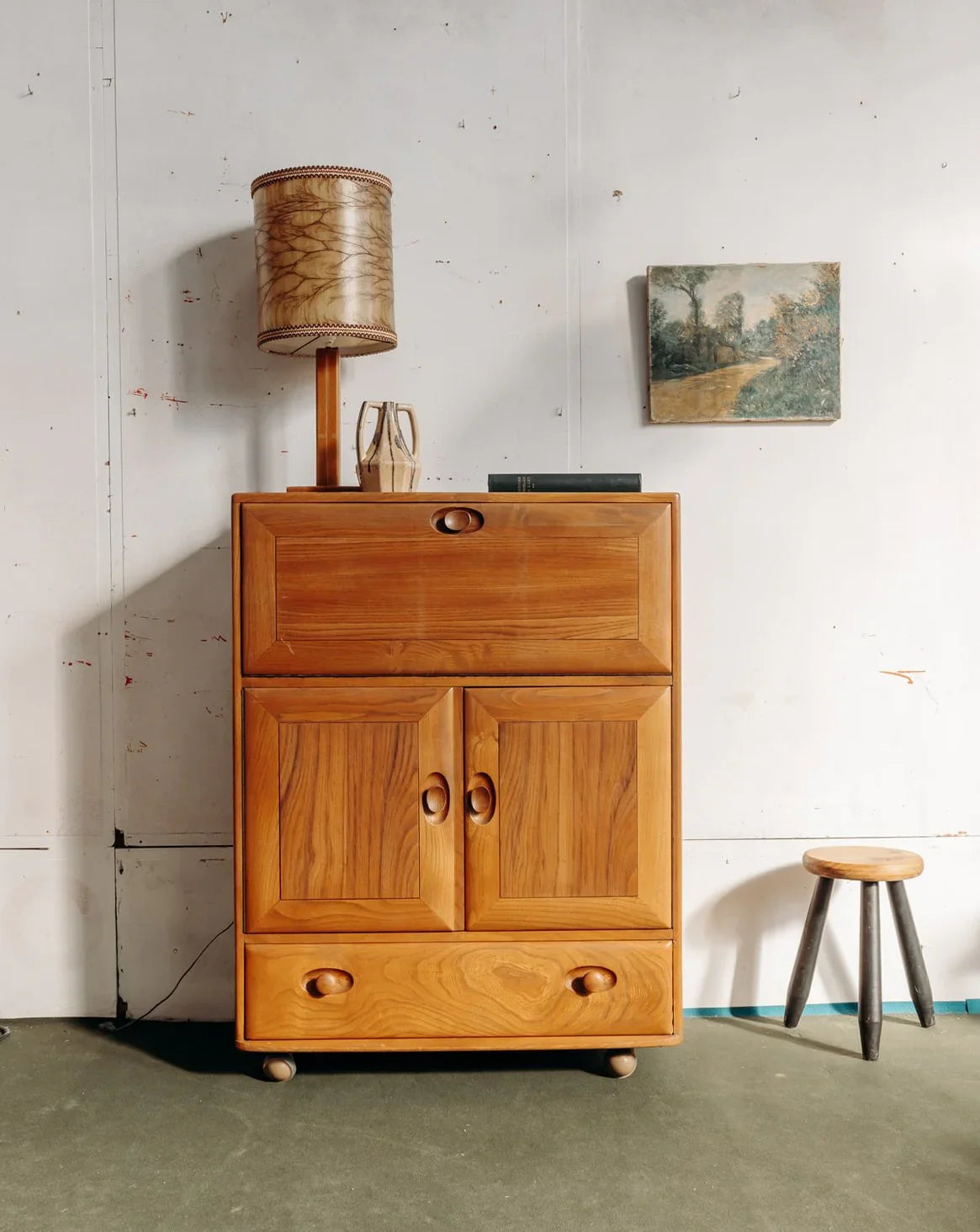 Découvrez le secrétaire Ercol, un meuble raffiné alliant élégance et fonctionnalité. Avec son design à rabat assez haut, il offre un espace de rangement supérieur idéal pour vos documents et objets personnels. Ses poignées sculptées ajoutent une touche artisanale à l’ensemble, tandis que le placard et le tiroir inférieur garantissent un rangement optimal et organisé. Un incontournable pour les amateurs de décoration vintage alliant charme et praticité. L’étagère du placard est réglable.