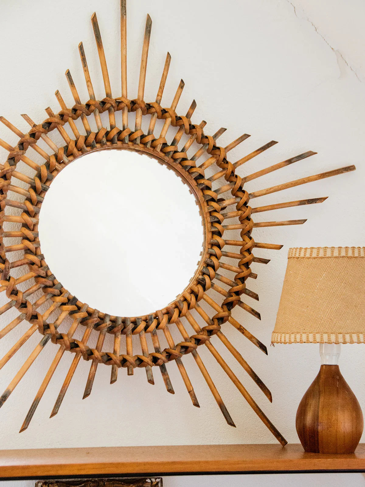 Découvrez ce miroir soleil en bois, au charme naturel et vintage. Sa grande structure en rotin typique des années 60 apporte chaleur et caractère à votre intérieur. Une pièce forte qui habille instantanément un mur. Parfait dans une entrée, un salon ou une chambre. Un bel hommage aux inspirations rétro.