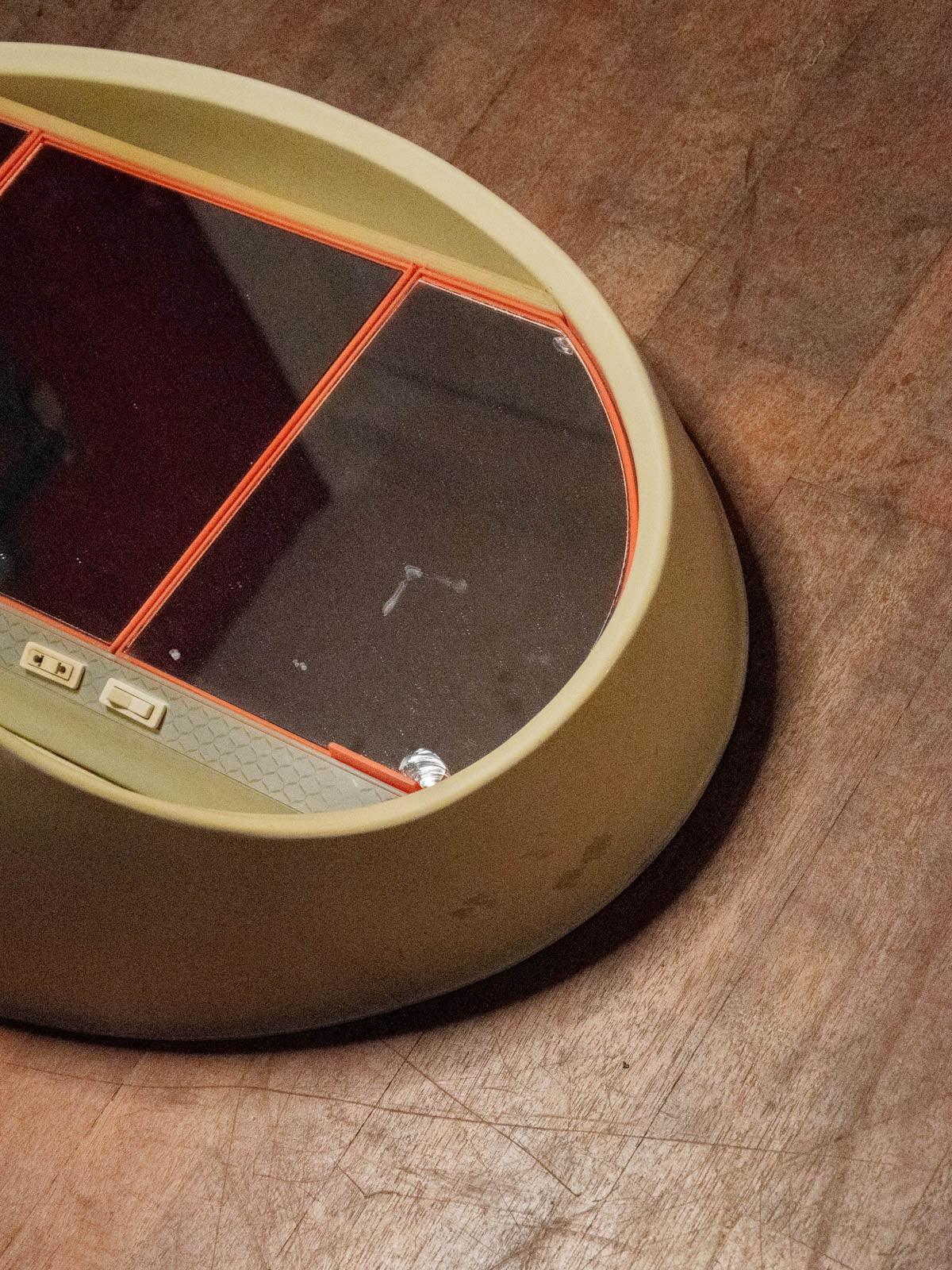 Sublimez votre intérieur avec cette coiffeuse ovale des années 70 au design space-age, qui impose une silhouette graphique et ludique. Ses trois portes-miroirs à encadrements orange apportent une touche pop tandis que la structure en plastique blanc, légère et résistante, intègre une petite étagère pratique pour vos soins et accessoires. Idéale pour un coin maquillage ou une chambre au style rétro, elle invite à créer une ambiance vitaminée et singulière. N’est plus électrifiée.