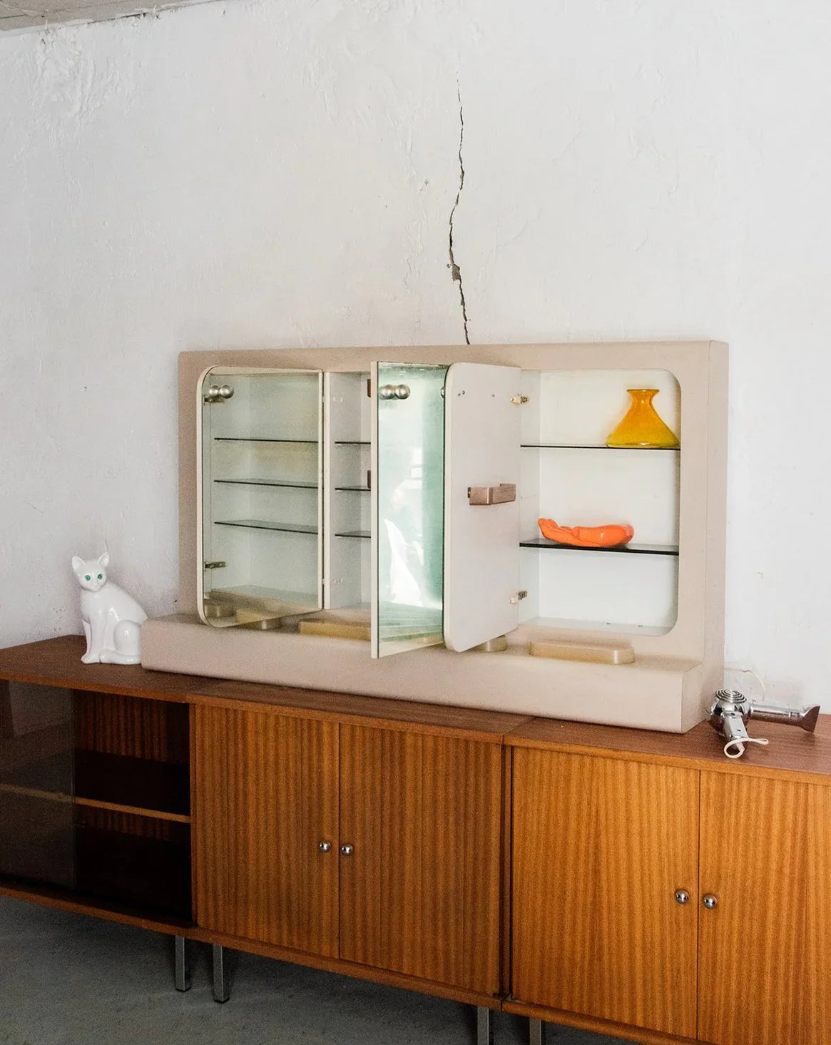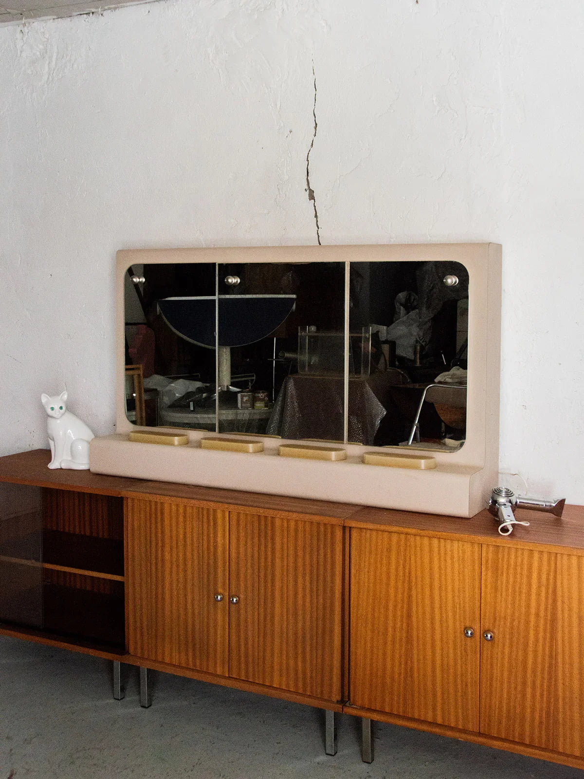 Découvrez ce miroir coiffeuse au charme rétro, parfait comme meuble de salle de bain ou d’appoint. Doté de miroirs en mercure et de quatre blocs lumineux, il offre une belle luminosité une fois le système électrique rebranché. Le meuble, en bois avec plaquage plastique, allie robustesse et style vintage. Derrière ses trois portes se trouvent trois étagères par compartiment, offrant un rangement généreux. Quelques marques du temps viennent souligner son authenticité.