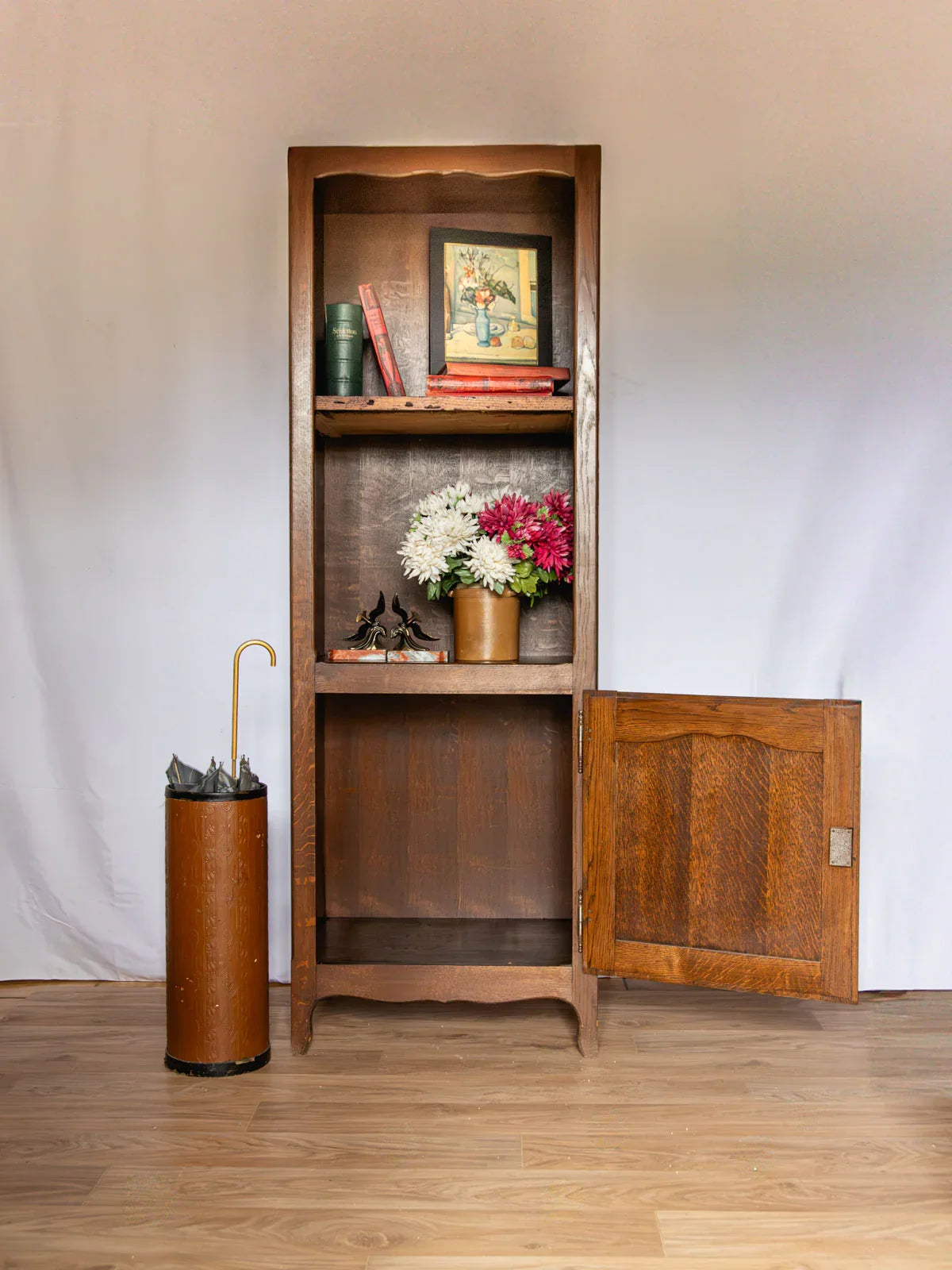 Invitez dans votre intérieur cette bibliothèque pouvant aussi servir d’étagère, en bois foncé ciré aux lignes sobres et chaleureuses, pensée pour maximiser le rangement vertical sans encombrer l’espace. Sa porte basse et le passage de câble dans le fond de la partie ouverte, la rendent idéale pour mêler livres, objets décoratifs et équipements multimédia. L’ensemble dégage une présence élégante et patinée qui s’intègre autant au salon qu’au bureau, la finition cirée faisant ressortir le veinage du bois. Quelques éraflures et éclats dans le placage, traces du temps.