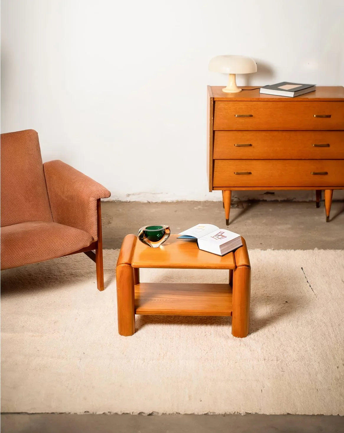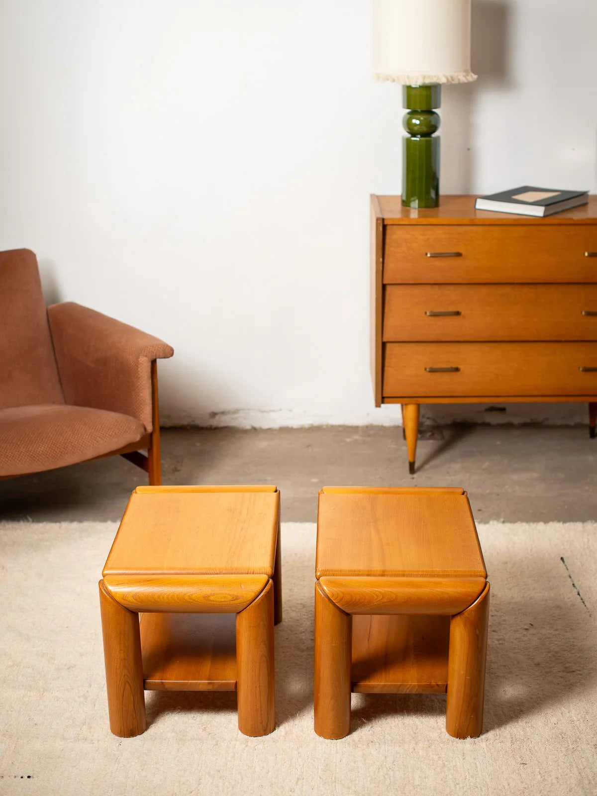 Cette paire de chevets, en orme massif et datant de la fin des années 70, évoque le charme intemporel du style maison Regain. Leur design raffiné se distingue par des doubles plateaux et une structure arrondie, offrant à la fois fonctionnalité et esthétique. La chaleur naturelle du bois ajoute une touche accueillante à votre chambre, tandis que leur silhouette douce s’harmonise facilement avec divers décoration. Parfaits pour rehausser votre espace tout en offrant un rangement pratique, ces chevets sont un incontournable pour les amateurs de mobilier au caractère authentique. Ils peuvent aussi servir de petite table basse ! Vendus par paire.