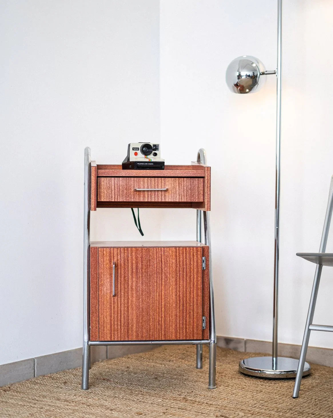 Adoptez cette table de chevet d’internat des années 60 alliant métal chromé et plateau en formica. Ses lignes industrielles et ses proportions élancées offrent un rangement pensé avec un tiroir et une porte pour garder livres et objets à portée de main. La poignée en métal chromé souligne le caractère utilitaire et apporte une note rétro, idéale dans une chambre, un bureau ou une entrée au style sobre et chaleureux.