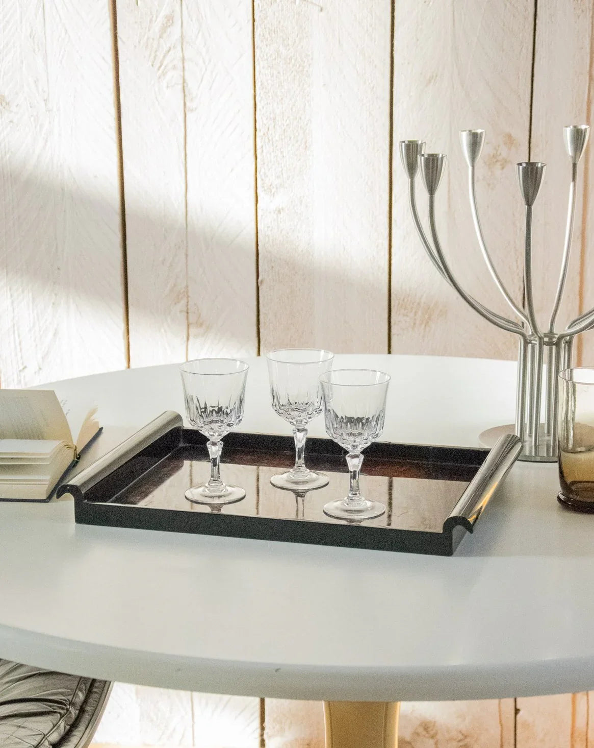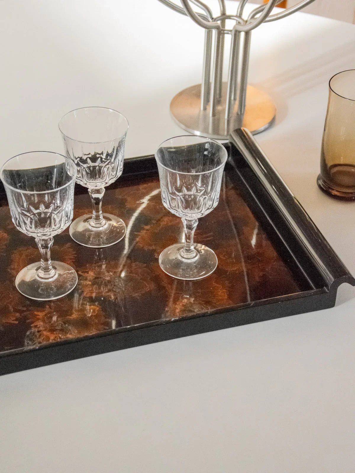 Adoptez ce plateau noir laqué au motif évoquant une fleur, dont la brillance souligne un dessin délicat et graphique. Conçu pour servir ou sublimer une composition d’objets, il offre des proportions pensées pour l’apéritif ou un plateau d’appoint sur une console. Le rendu laqué apporte une note contemporaine et soignée à une ambiance sobre et raffinée. Légères traces du temps présentes.