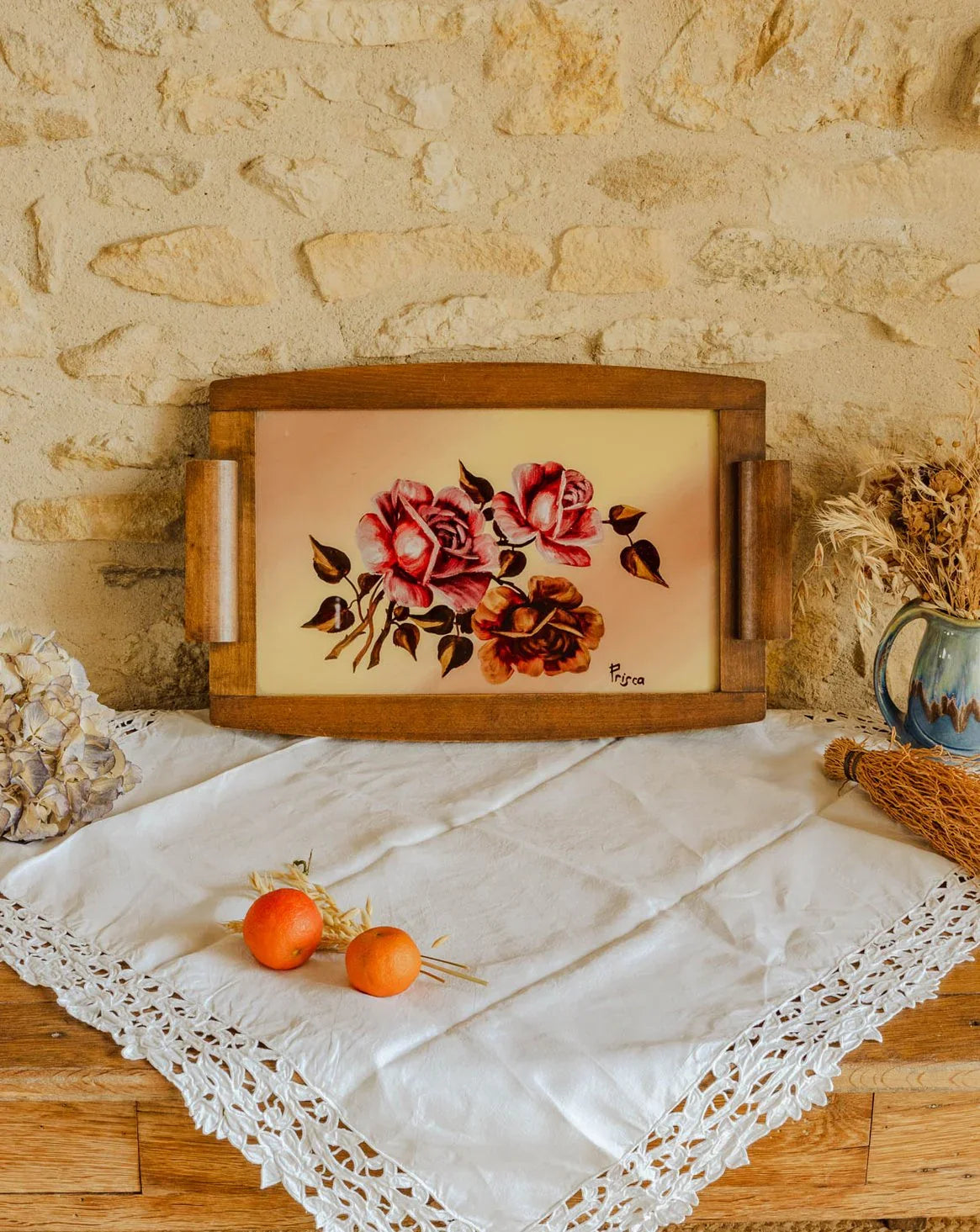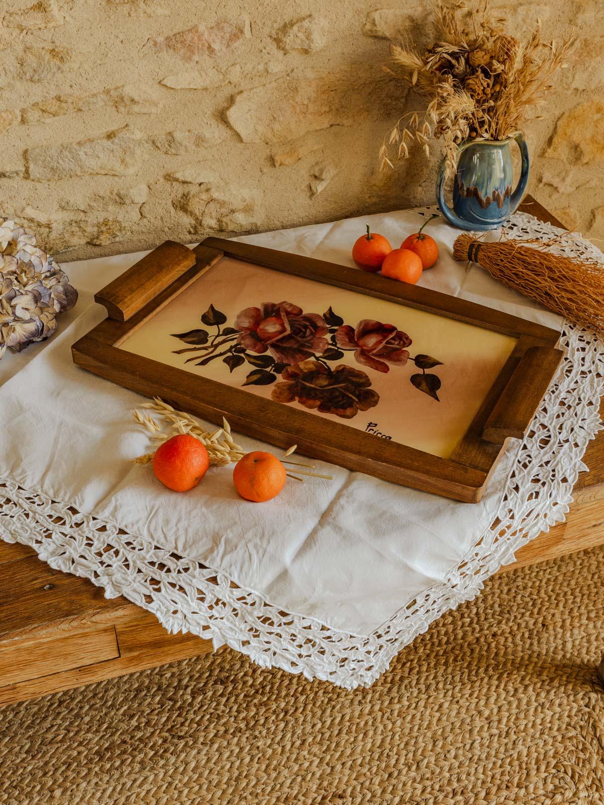 Découvrez ce plateau vintage signé Prisca, datant des années 1950, où un délicat dessin de roses occupe le centre, protégé par une vitre et entouré d’un support en bois chaleureux. Sa forme allongée lui permet d’accueillir tasses et sucreries, d’exposer bougies ou objets décoratifs, et de jouer le rôle d’un élégant centre de table. Le mariage du bois et du verre insuffle une ambiance rétro et poétique, idéale pour une décoration pleine de charme.