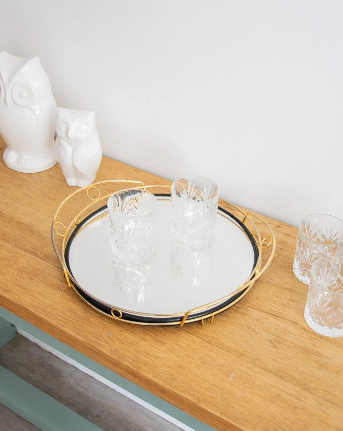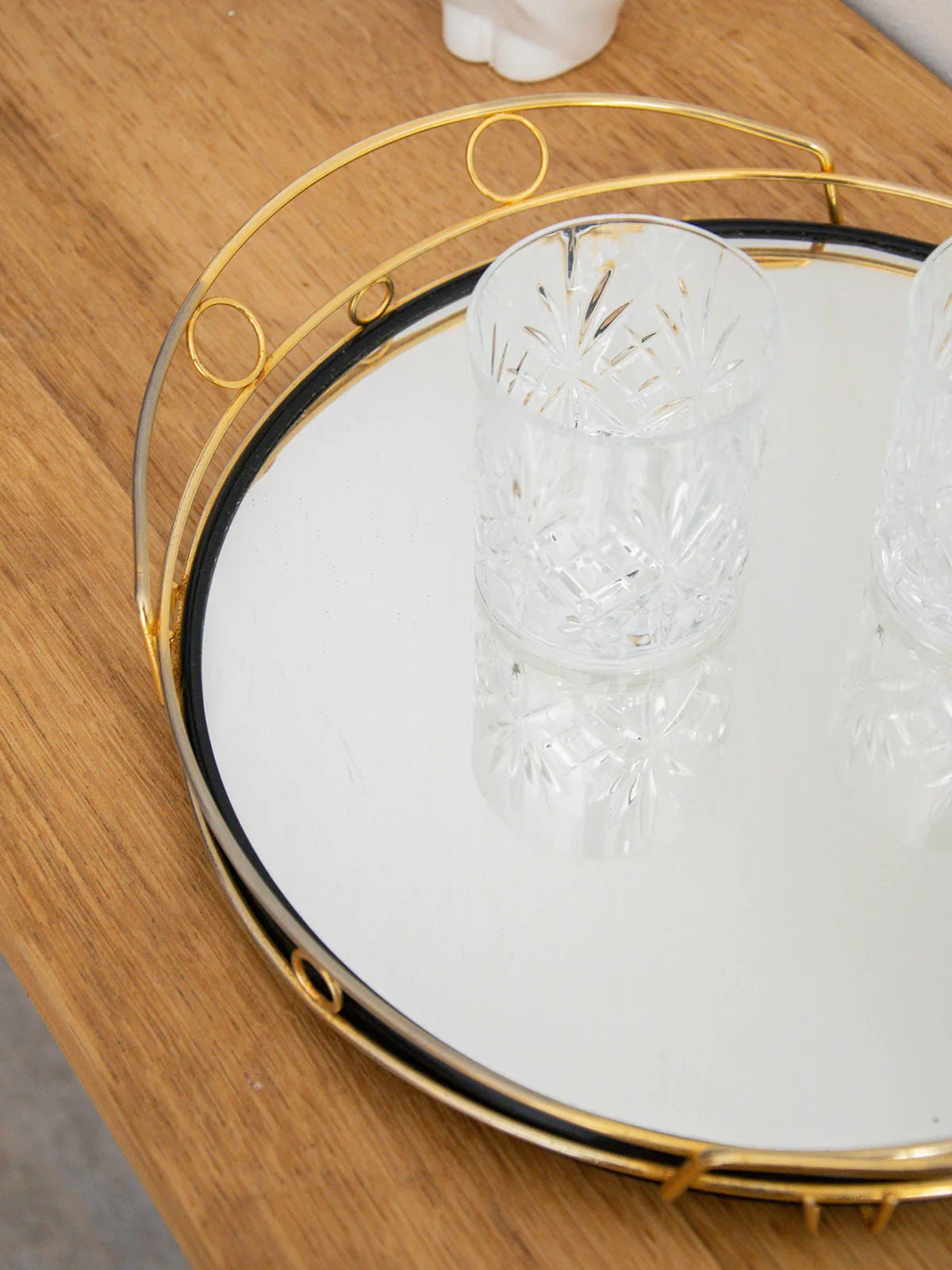 Apportez une touche d’élégance vintage avec ce magnifique plateau miroir, orné d’un cadre et de poignées en métal doré. Cette pièce décorative, bien qu’elle présente quelques marques sur le miroir et le métal, conserve tout son charme intemporel. Idéale pour sublimer vos espaces, c’est un accessoire incontournable pour les amateurs de décoration raffinée et vintage.