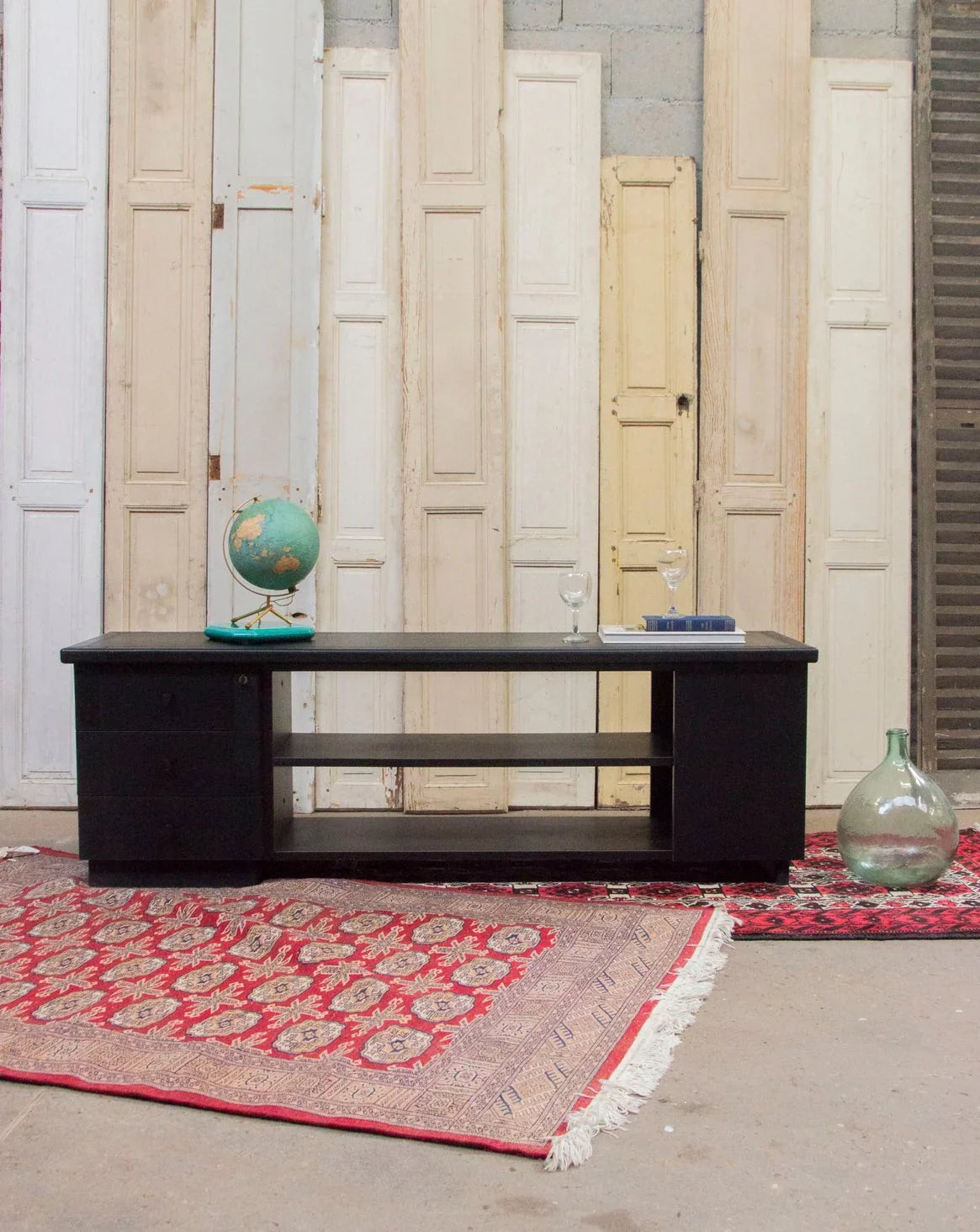 Adoptez cette enfilade en cuir noir au profil bas et aux proportions généreuses, qui impose une ligne contemporaine et raffinée. Deux grandes cases offrent un espace modulable pour dossiers et objets du quotidien, tandis que trois tiroirs fermant à clé garantissent un rangement sécurisé et soigné. Le cuir apporte une matière chaleureuse et une présence subtile, parfaite pour compléter un bureau en cuir ou structurer un salon élégant.