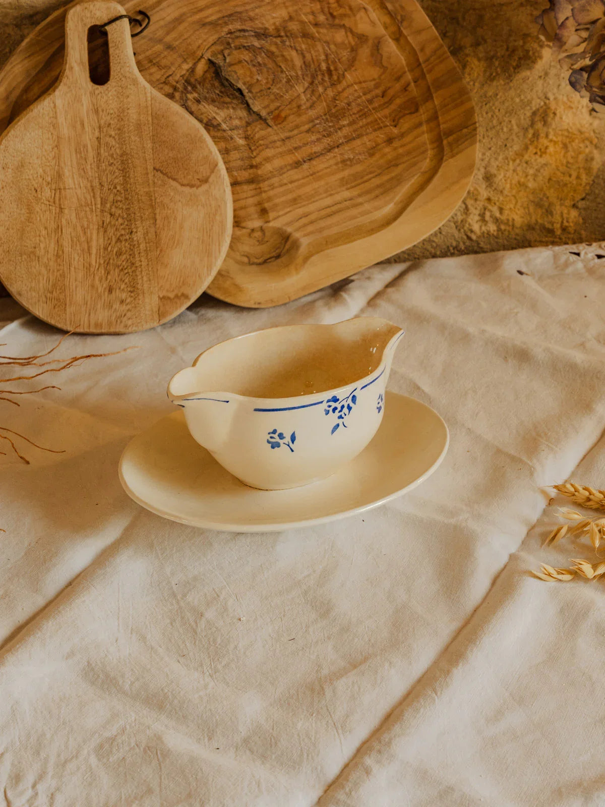 Sublimez votre table avec cette saucière Digoin Sarreguemines en terre de fer, délicatement ornée d’un motif de petites fleurs bleues. Son format et ses proportions équilibrées la rendent idéale pour présenter sauces, condiments ou petites préparations lors d’un repas convivial. La matière et l’émail fin témoignent d’un savoir-faire traditionnel, apportant une note authentique et champêtre à vos services de table. Parfaite pour une ambiance française, du déjeuner simple au dîner soigné.