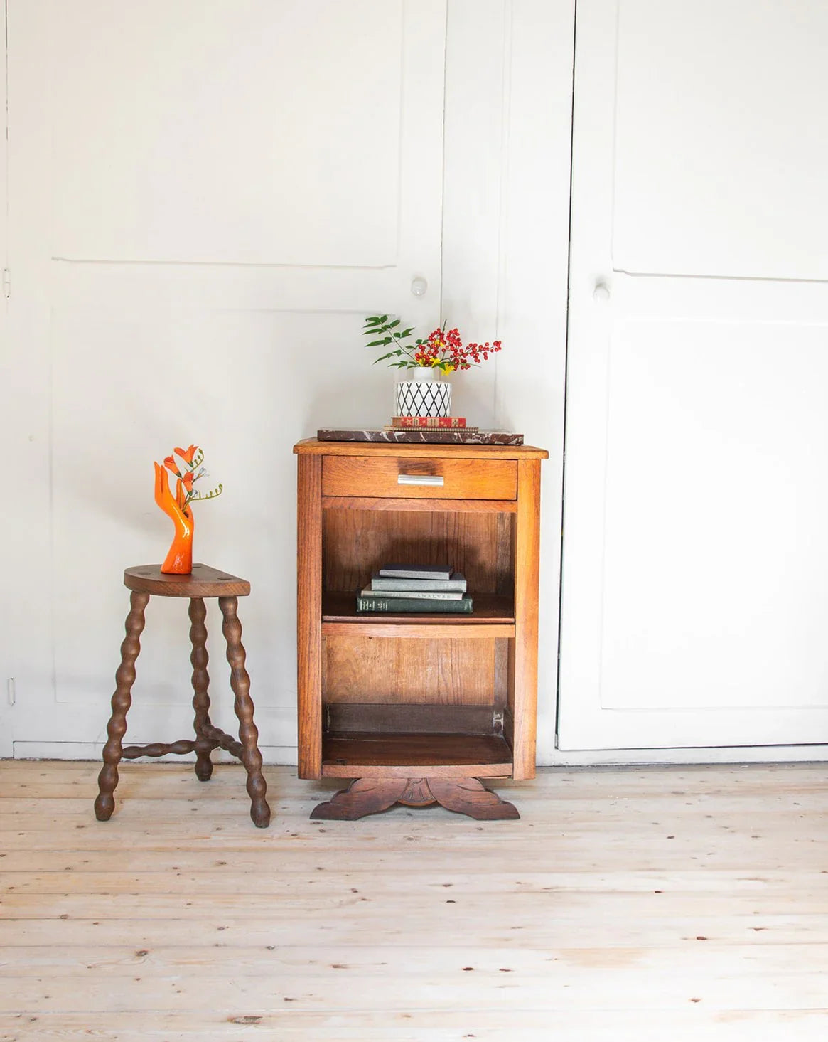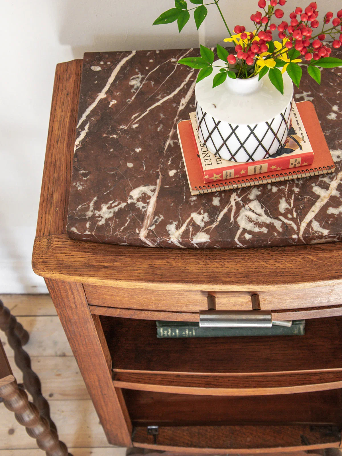 Apportez une jolie touche vintage à votre intérieure avec ce chevet en bois au style Art Déco, doté d’un plateau en marbre marron et blanc. Bien qu’une fissure soit présente sur le marbre, ce meuble reste une pièce unique, alliant charme et fonctionnalité grâce à son tiroir et son étagère. Avec des dimensions, il s’intègre parfaitement à tout coin de chambre.