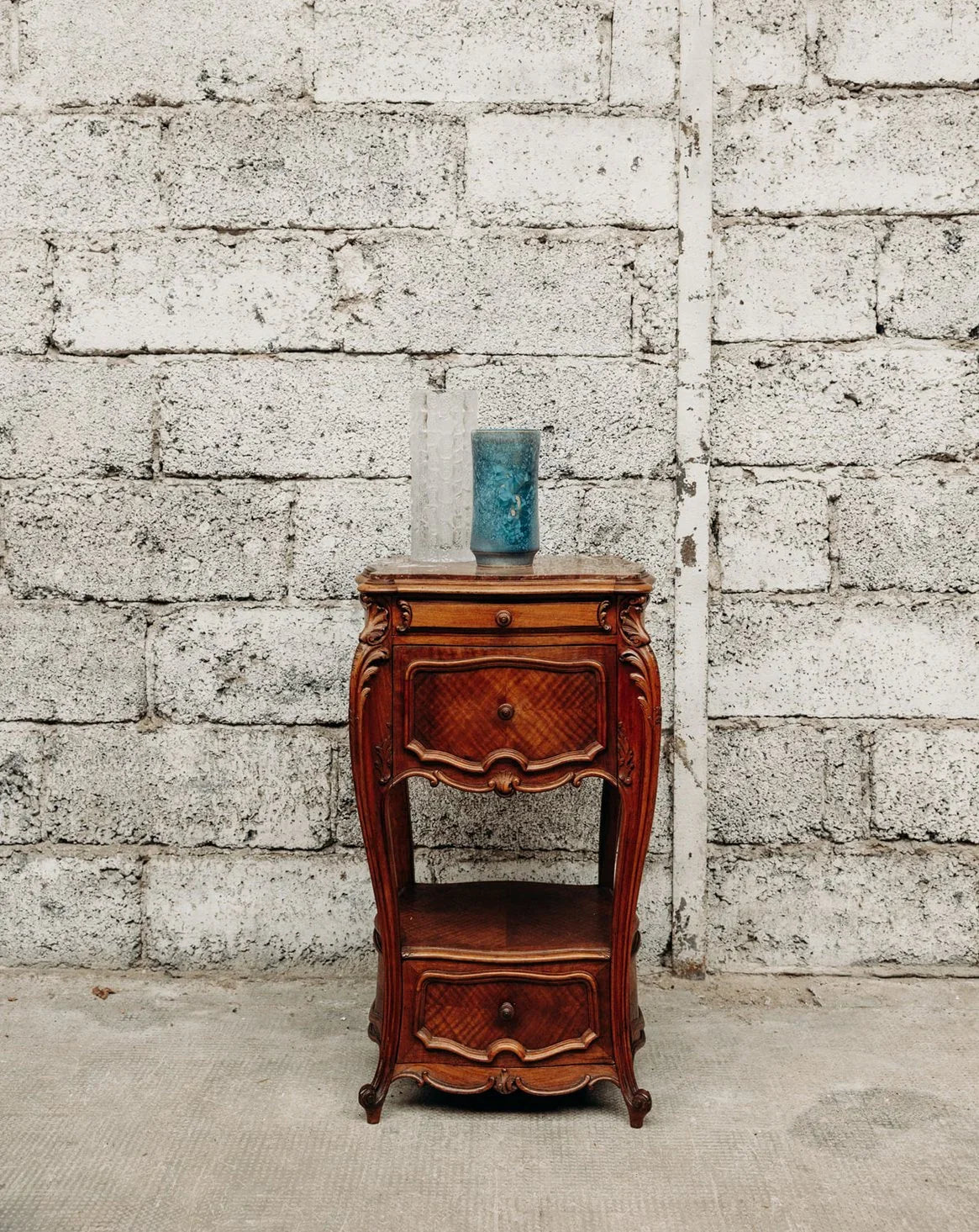 Offrez-vous cette élégante table de chevet Louis XV en bois de palissandre, au plateau en marbre terracotta marbré blanc qui ajoute une touche de charme à votre chambre. Son design galbé sur toutes les faces, ainsi que son style rococo, mettent en valeur la beauté de la marqueterie délicate. Ce meuble raffiné allie l’authenticité du mobilier ancien à une esthétique intemporelle. Parfait pour une décoration classique et luxueuse, il apportera une note de charme et de prestige. Un véritable trésor pour les amateurs de meubles d’exception.
