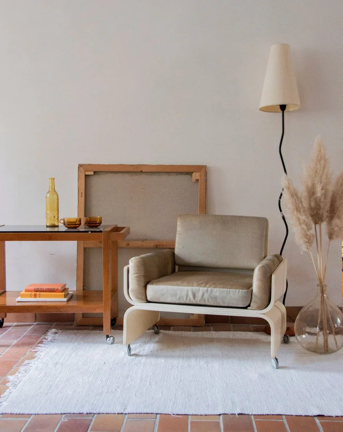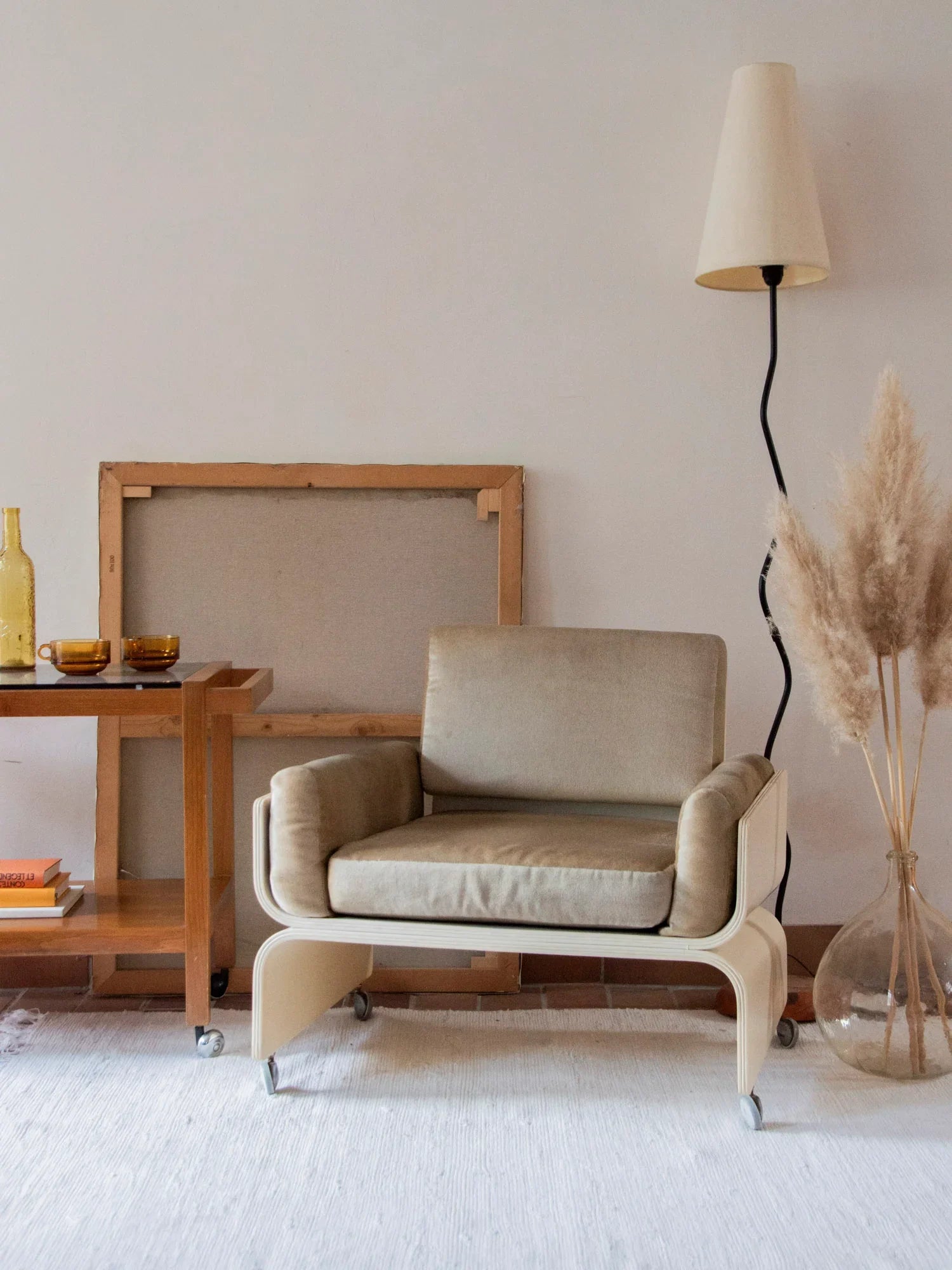 Découvrez cette magnifique chauffeuse / fauteuil de style space age des années 70, alliant une structure en bois courbé laqué blanc à trois coussins en velours beige d’origine. Inspiré des créations emblématiques de Mario Bellini, son design audacieux et élégant fait de cette pièce un incontournable du mobilier contemporain. Avec ses petites roues parfaitement fonctionnelles et son confort exceptionnel, cette assise se révèle à la fois pratique et esthétique. En très bon état général, ce fauteuil ne présente aucun trou sur le tissu et apportera une touche d’originalité à votre intérieur.